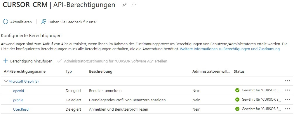 Klicke Anschließend über der Tabelle auf "Administratorzustimmung für 'CURSOR Software AG' erteilen".