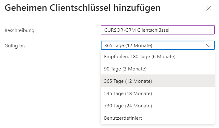 Da der Clientschlüssel nur im Rahmen der Anlage einsehbar ist, muss dieser extra gesichert bzw. direkt in CURSOR-CRM gespeichert werden.