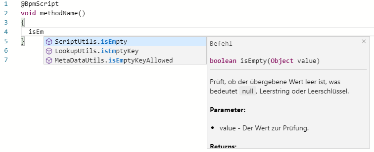 GROOVY@BpmMaskScript @MaskScript @BpmScript private Type methodName() { ... }Öffentliche Methode: Diese kann von weiteren Skript-Klassen, Prozessen und Maskenskripten verwendet werden (sofern die entsprechenden Annotations gepflegt sind, siehe unten)