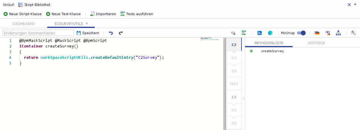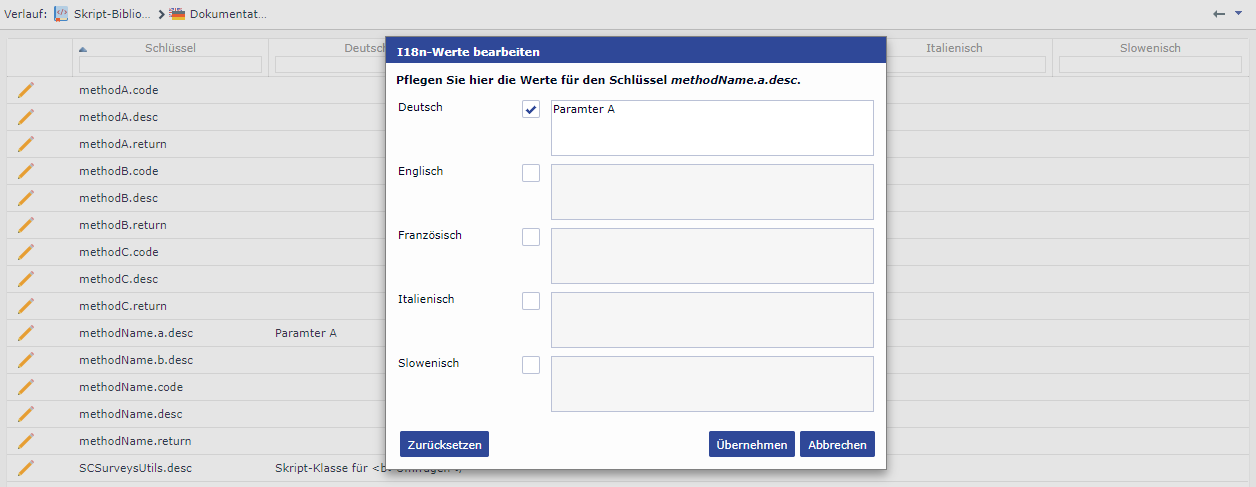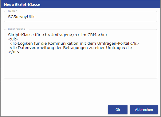 Die Beschreibung bzw. Dokumentation der Skript-Klasse dient dem Verwender oder späteren Bearbeiter der Skript-Klasse zur ersten Orientierung mit dieser Klasse. Einfache HTML-Formatierungselement (siehe Dokumentation) können in der Beschreibung eingesetzt werden, um sie für den Anwender lesbarer zu gestalten. Die Dokumentation der Skriptklasse kann auch später für andere Sprachen ergänzt werden. Der Schlüssel für den Klassen-Kommentar lautet in unserem Beispiel SCSurveyUtils.desc.