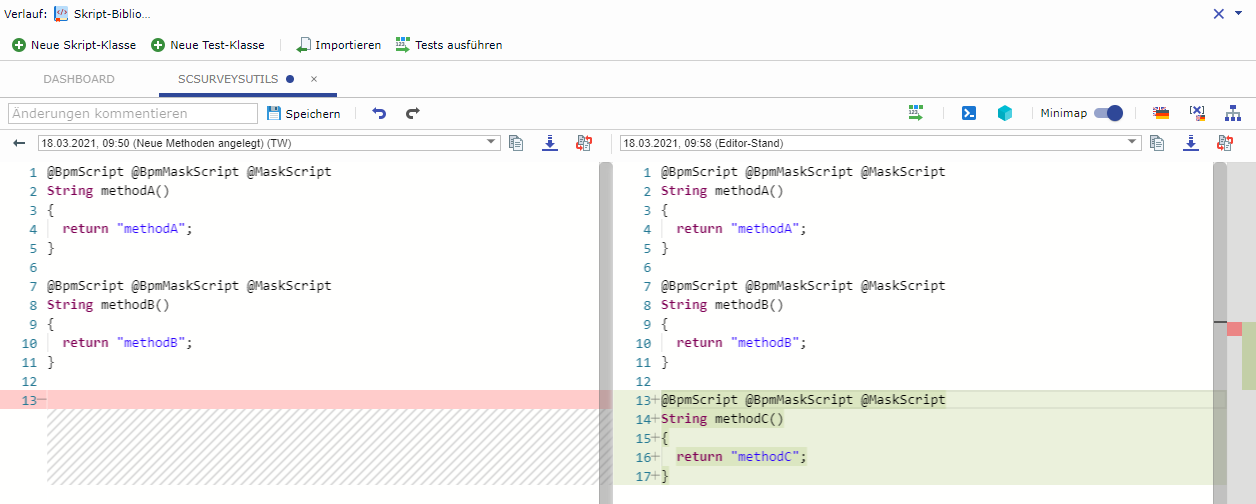 Vor dem Speichern von umfangreichen Änderungen an der Skript-Klasse sollte man die Anpassungen mit dem letzten Stand vergleichen, z.B. um evtl. noch vorhandenen Debug-Code oder Ähnliches vorher noch zu korrigieren.