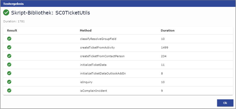 Jede zu testende Skript-Klasse wird als Testfall zum Testlauf aufgeführt.Testschritt: