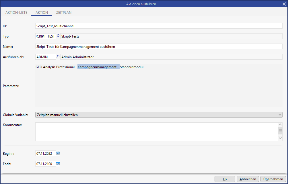 Für Zeit-Aktionen vom Typ SCRIPT_TEST können in den Parametern die im System aktiven Module ausgewählt werden. Es ist somit möglich, die Skript-Tests für unterschiedliche Module durch verschiedene User (Feld "Ausführen als") ausführen zu lassen. Die Skripttests werden dabei mit dem Hauptmandanten des eingetragenen Users ausgeführt. Im Standard sind alle Module ausgewählt. Eine Auswahl eines Moduls, mehrerer oder aller Module ist möglich.