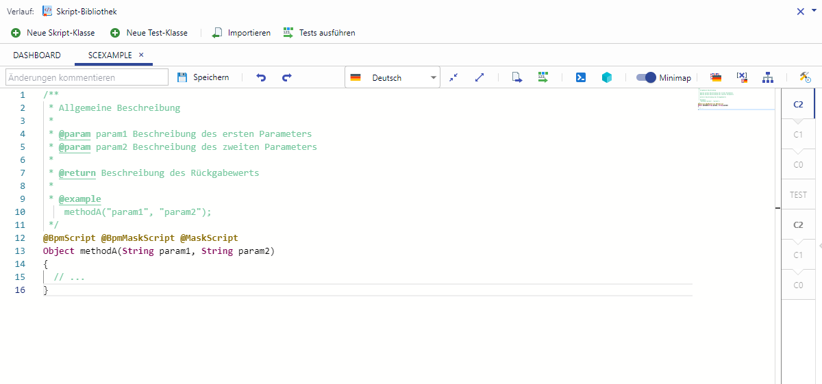Die zentralen Geschäftslogiken Ihrer individuellen CRM-Lösung können in der Skript-Bibliothek gesammelt werden. In der Skript-Bibliothek befinden sich (übersteuerbare) Standard-Klassen (C0), Klassen aus installierten (C1-)Modulen als auch Eigenimplementierungen (in der C2-Schicht).
