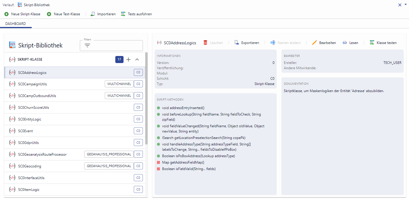 Das Dashboard der Skript-Bibliothek zeigt die Übersicht aller verfügbaren Skript-Klassen, deren Methoden und Dokumentation.