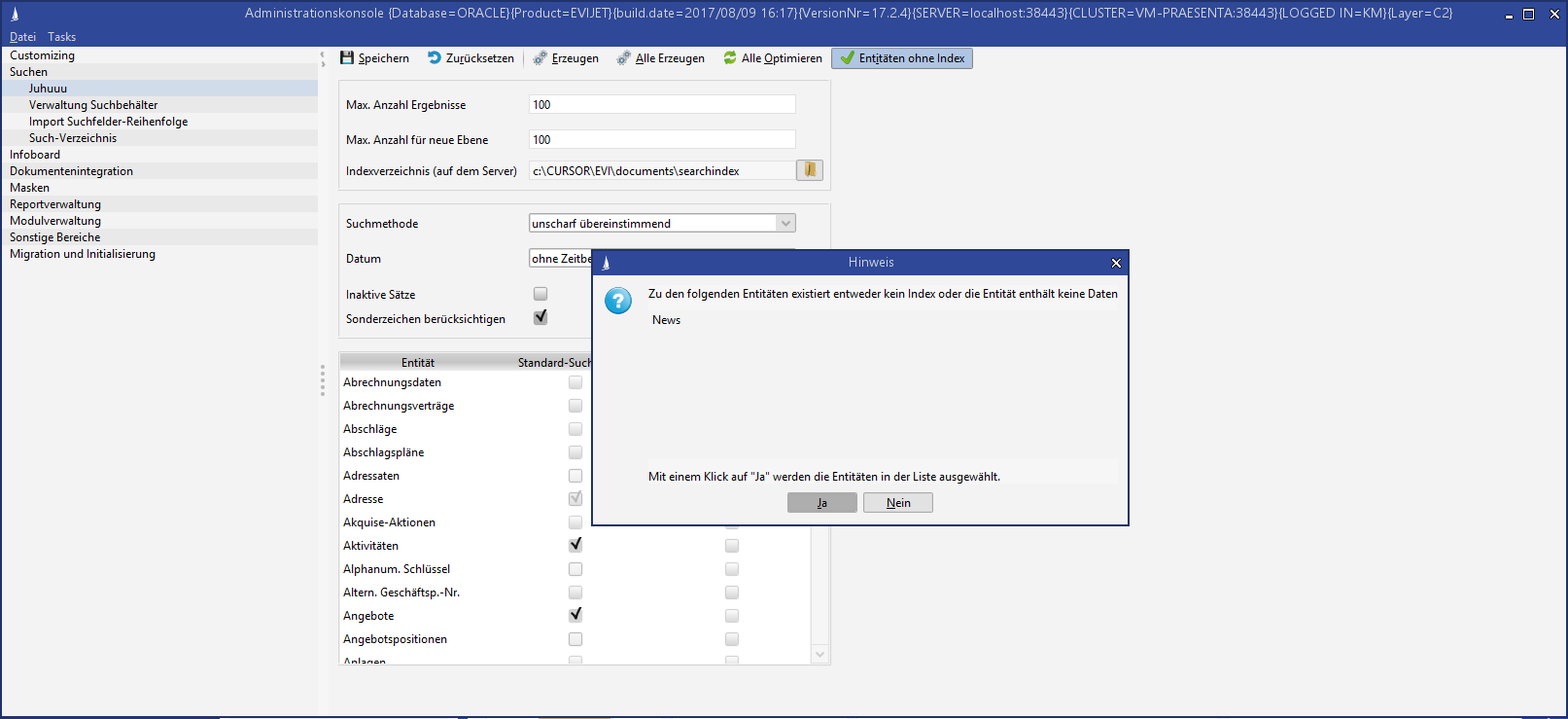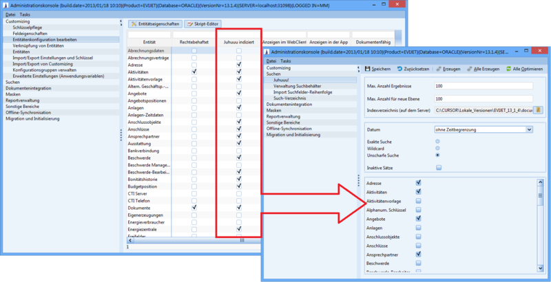 Abbildung: Entitätenkonfiguration Bearbeiten, Spalte: 'Juhuuu indiziert'