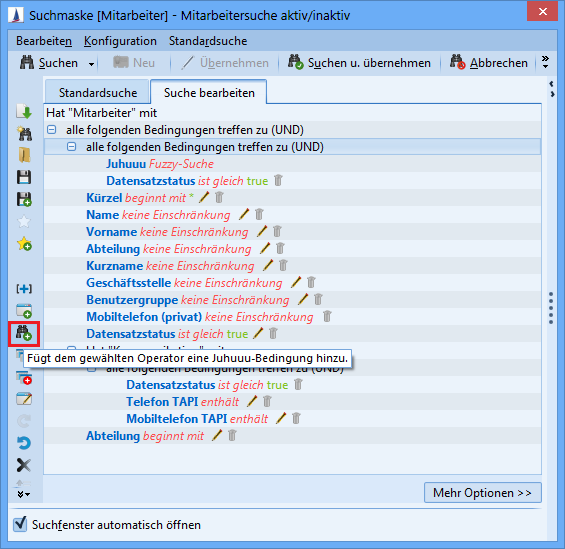 Für den Anwender präsentiert sich die Juhuuu! Suche im Applikationsfenster oben links und kann über die Schaltfläche 🔎 bzw. bei vorheriger Eingabe eines Stichwortes in das vorstehende Feld gestartet werden.