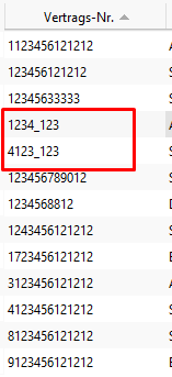 Enthält die Vertragsnummer allerdings ein "Whitespace" wie z. B. den Underscore, so werden auch diese Ergebnisse gefunden.