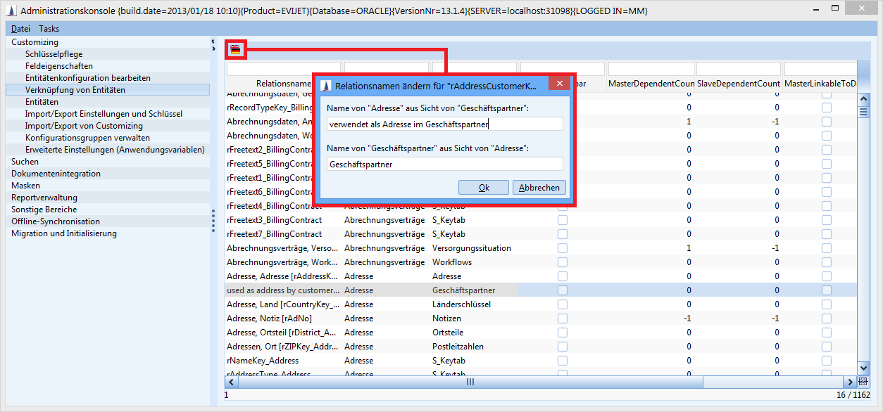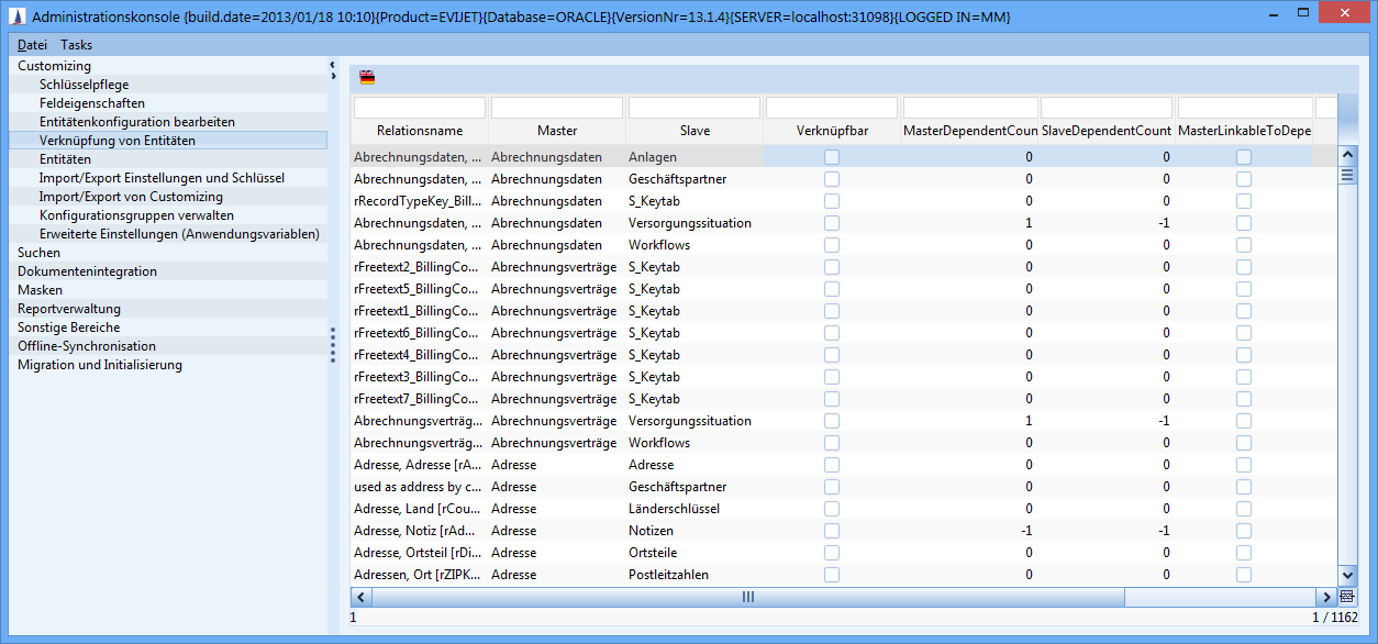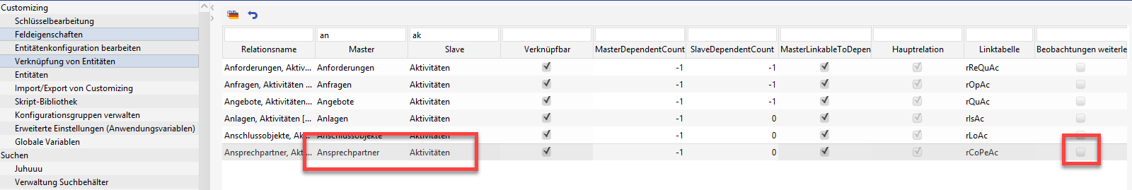 Hauptrelation | Die Spalte ist nicht editierbar und hat nur informativen Charakter. Die Einstellung wird im Menüpunkt Entitäten vorgenommen. |