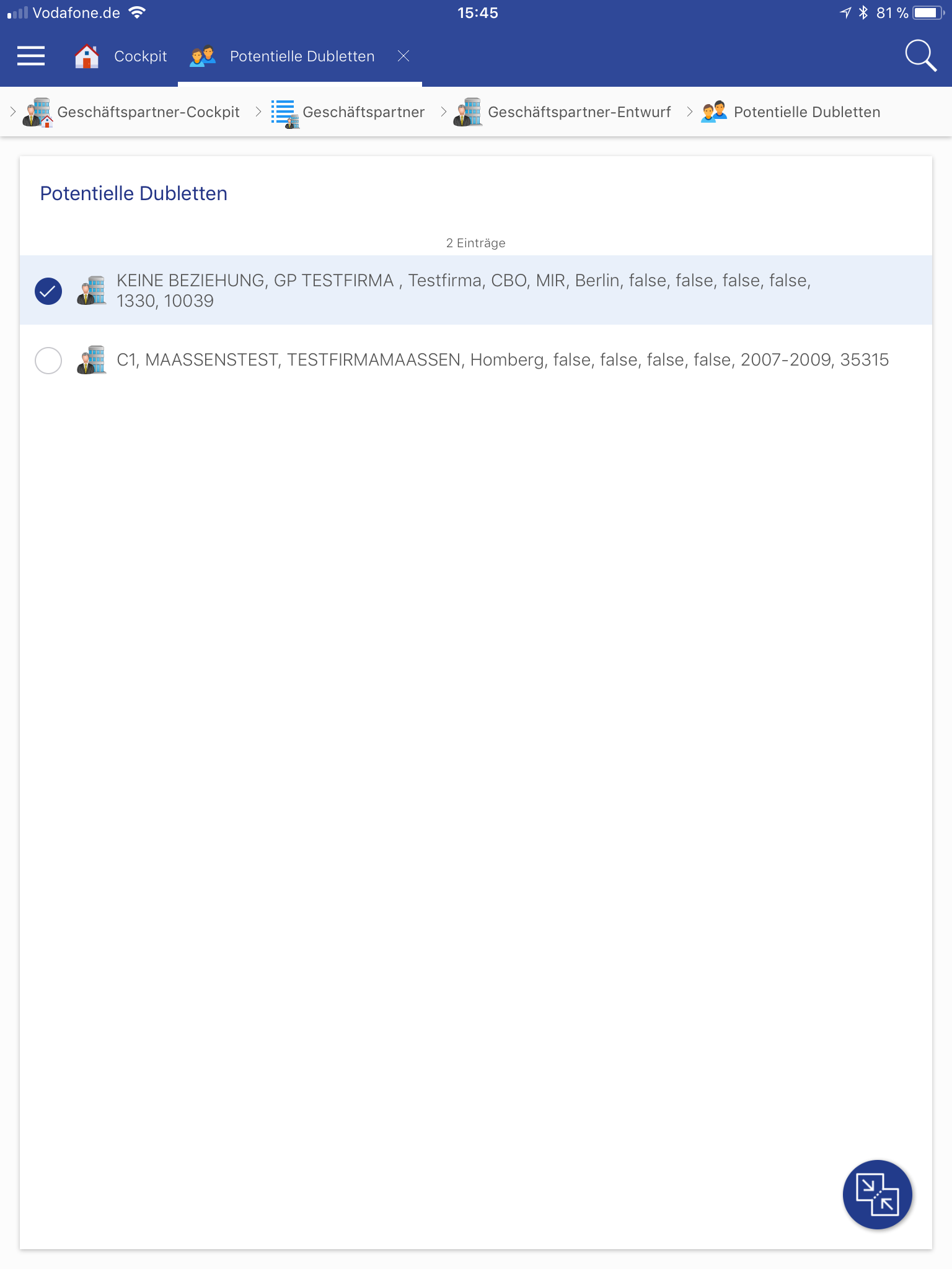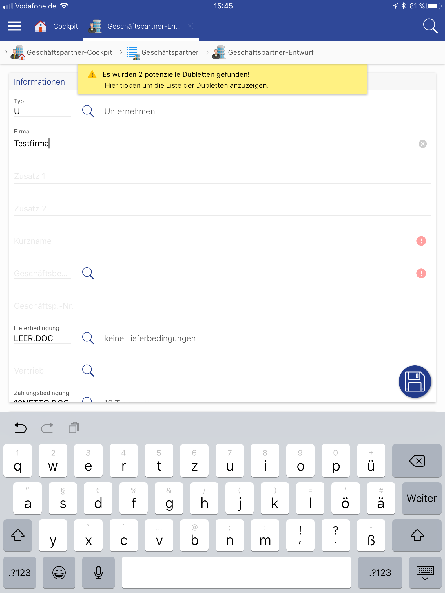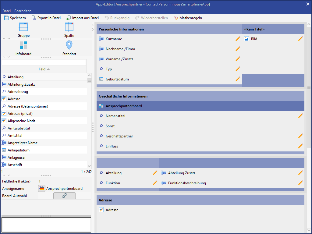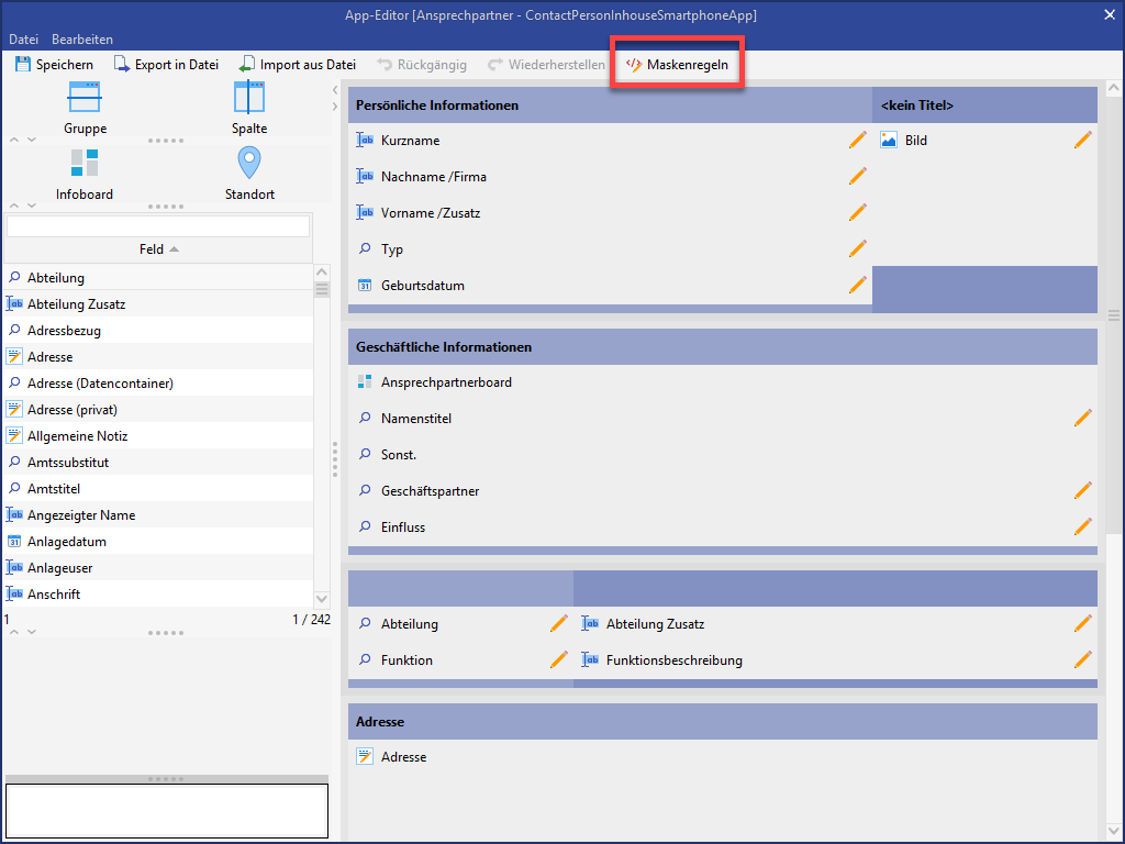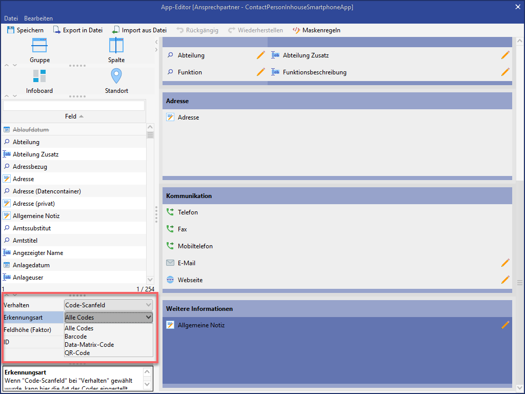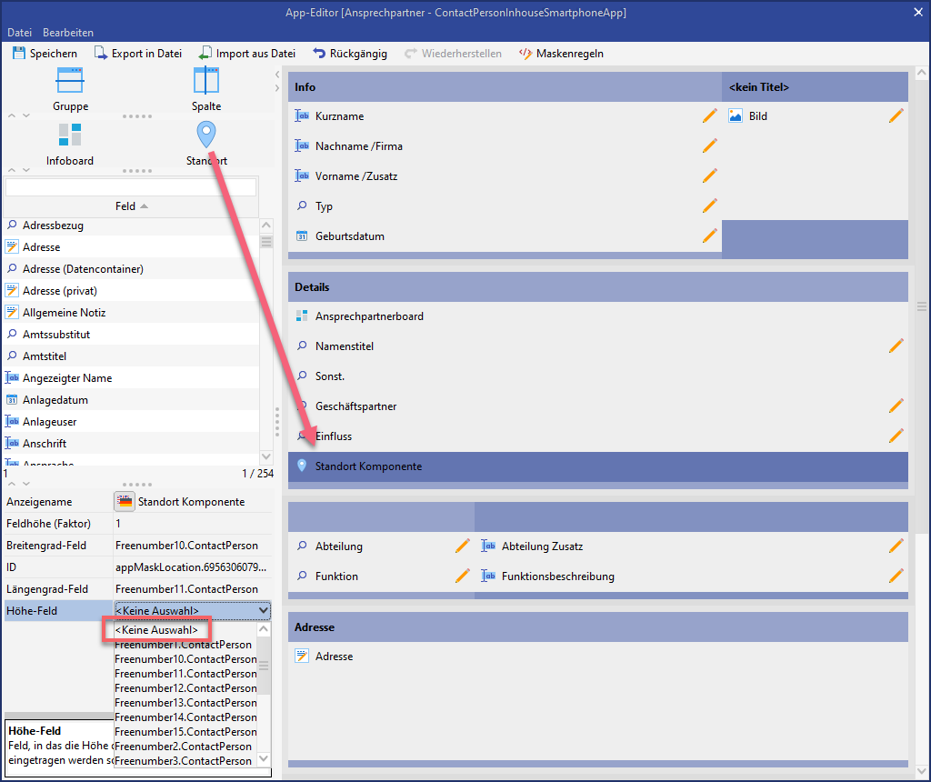 Daher müssen alle in der Dokumentenvorlage hinterlegten Felder auch auf der App Maske enthalten sein.