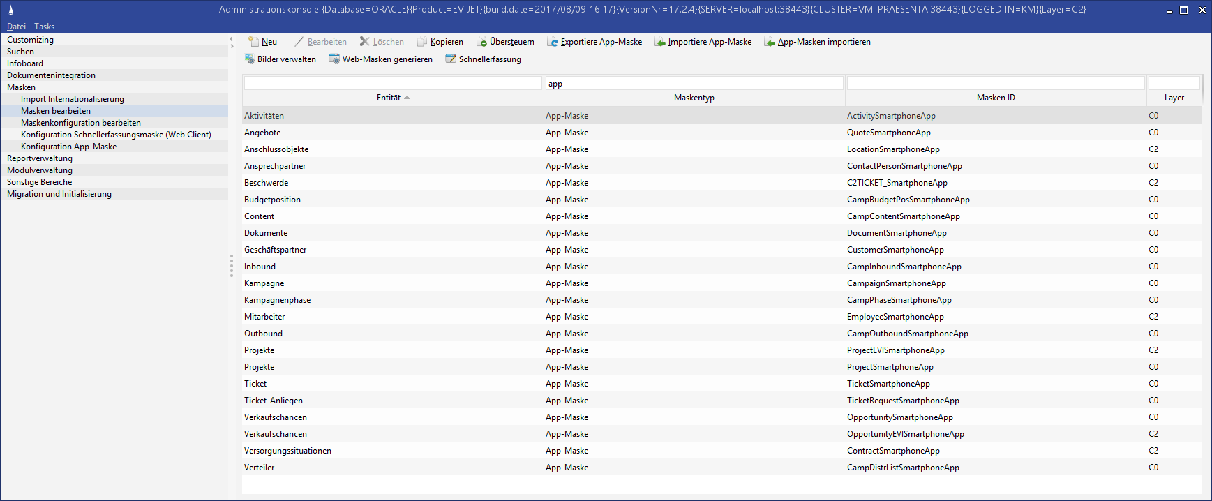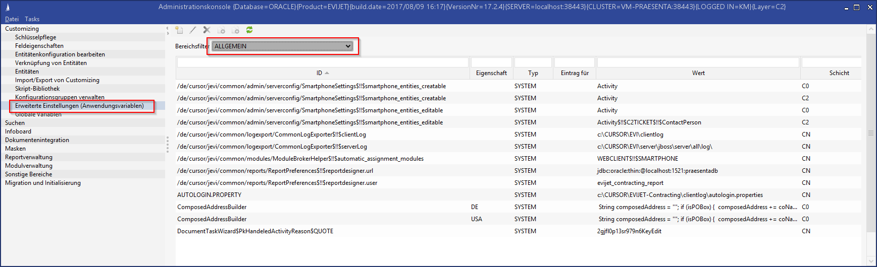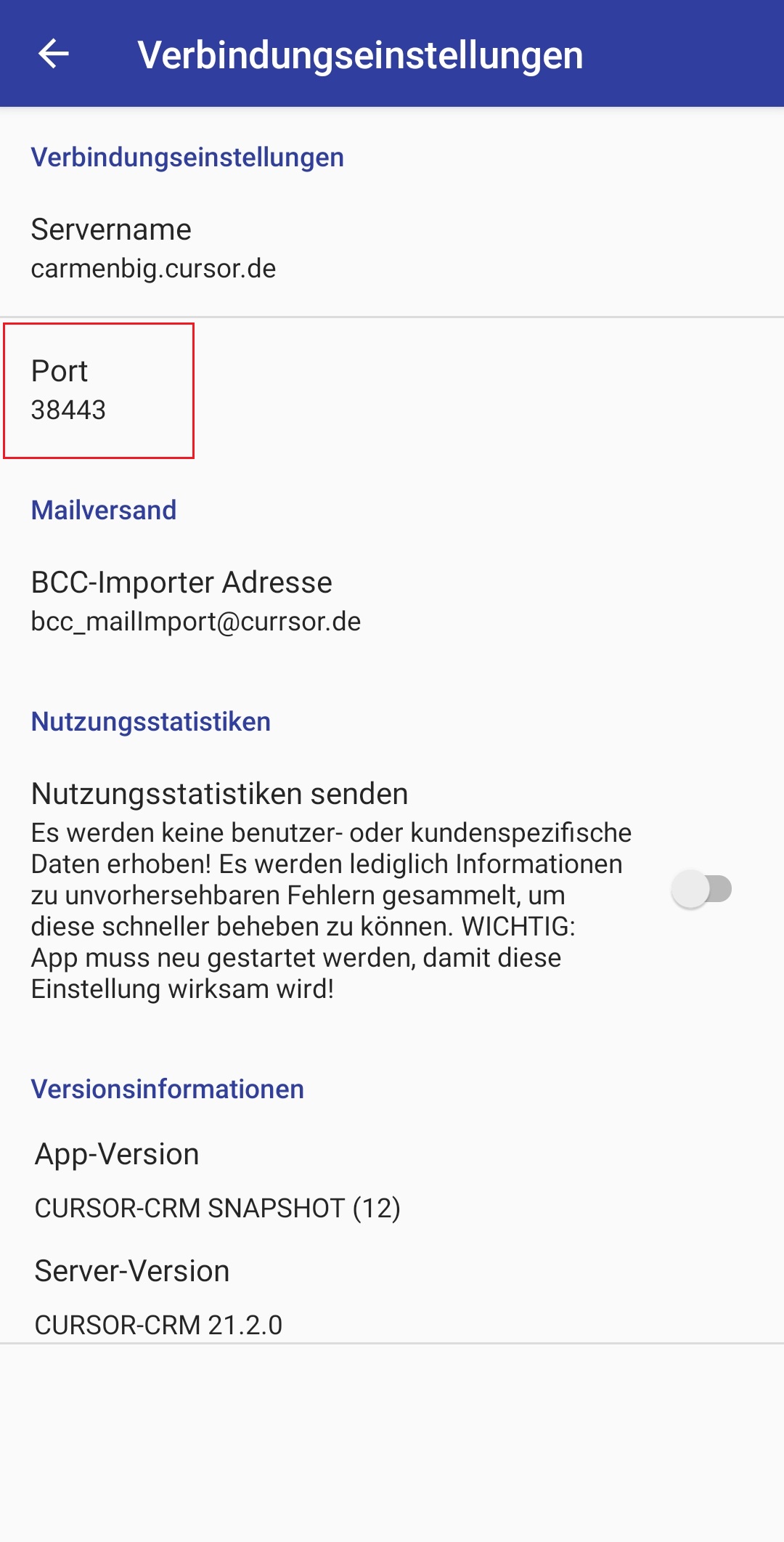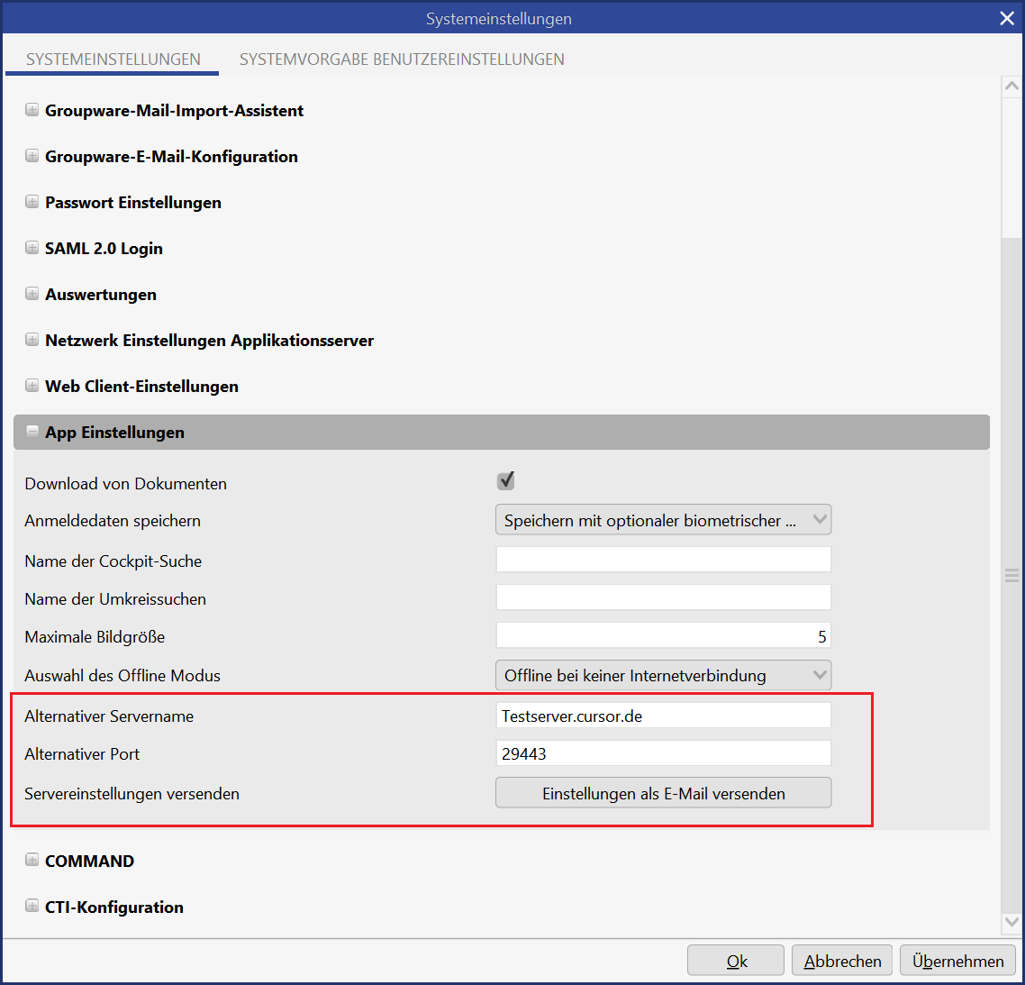 In der CURSOR-App muss entweder manuell oder über eine Konfigurationsdatei die Serverkonfiguration hinterlegt werden. Diese Serverkonfiguration kann über den Menüpunkt Administrationskonsole / Systeminformationen erzeugen ausgelesen werden. In der erzeugten Mail stehen unter dem Punkt App informations die für die CURSOR-App zu hinterlegenden Informationen: