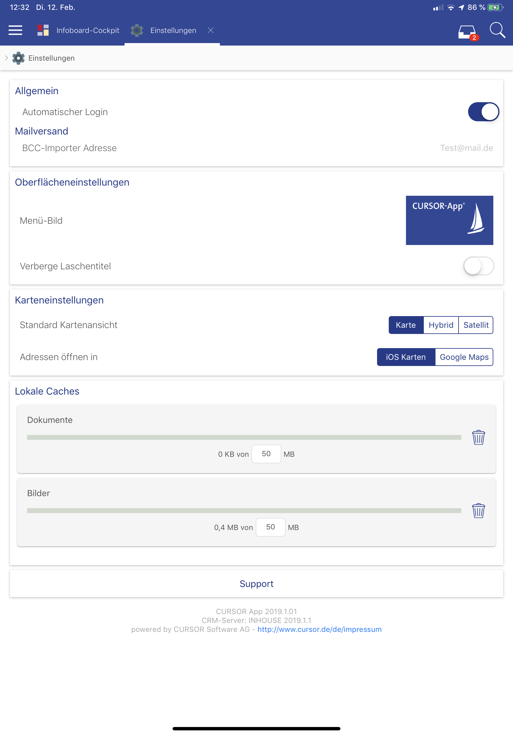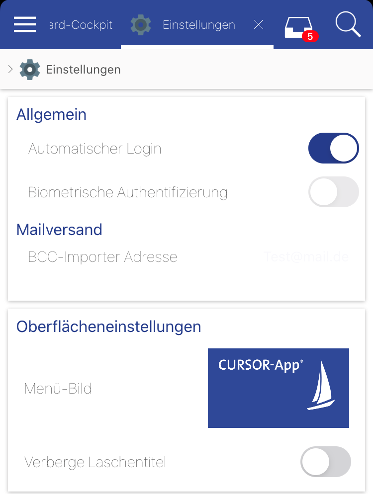 Einstellungen der CURSOR-App auf iOS