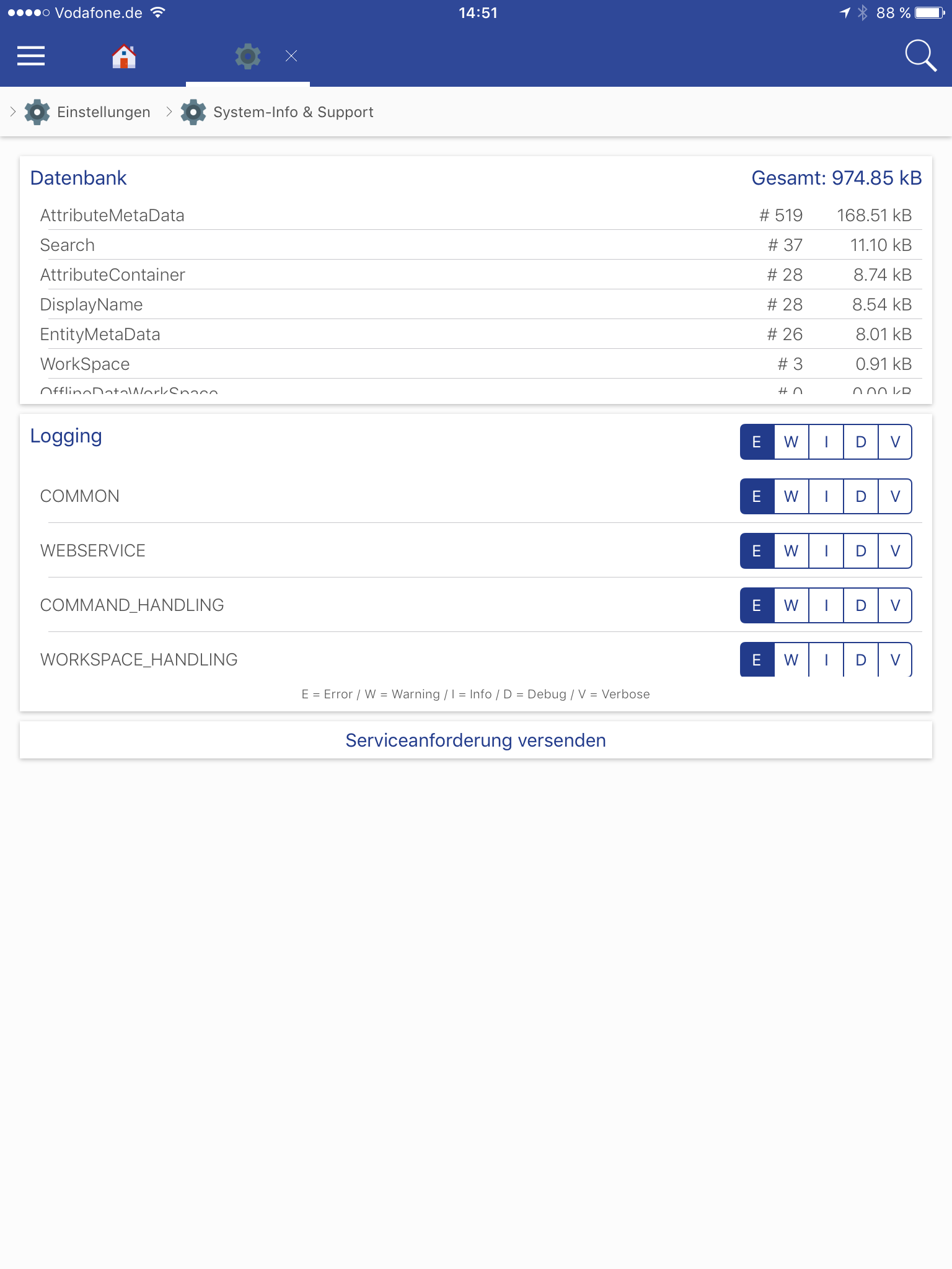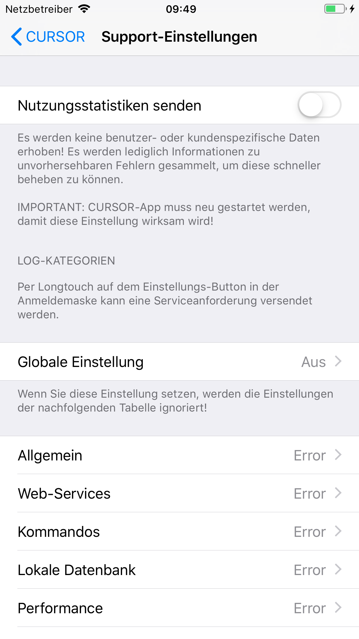 Sollten Fehler direkt bei der Anmeldung auftreten und man sich somit nicht anmelden kann, hat man die Möglichkeit in den iOS Einstellungen das Logging zu aktivieren. Hierzu gibt es in den Einstellungen den Menüpunkt "Support-Einstellungen" über den das Logging "Globale Einstellung" aktiviert werden kann. Die Serviceanforderung kann in der Anmeldemaske über einen Longtouch auf das Einstellungen-Zahnrad unten rechts versendet werden.