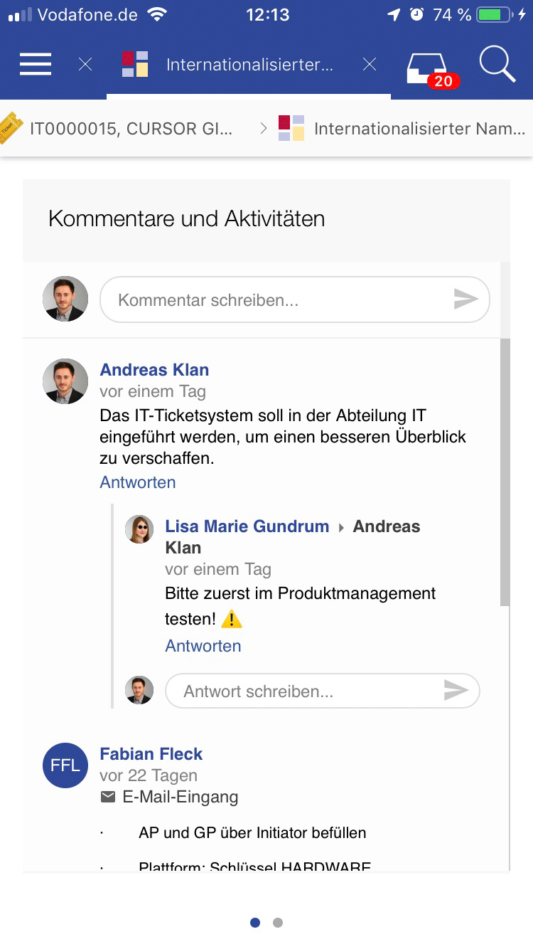 Wenn ein Fehler auf der App auftritt und dieser reproduzierbar ist, gibt es die Möglichkeit eine Log-Datei an den Administrator (bzw. die CURSOR Software AG) zu senden. Hierzu gibt es in den Einstellungen den Menüpunkt "Support" → "Serviceanforderungen versenden" über den eine Mail erzeugt wird, in der eine detailliertere Beschreibung hinterlegt werden kann und die Log-Dateien enthalten sind.
