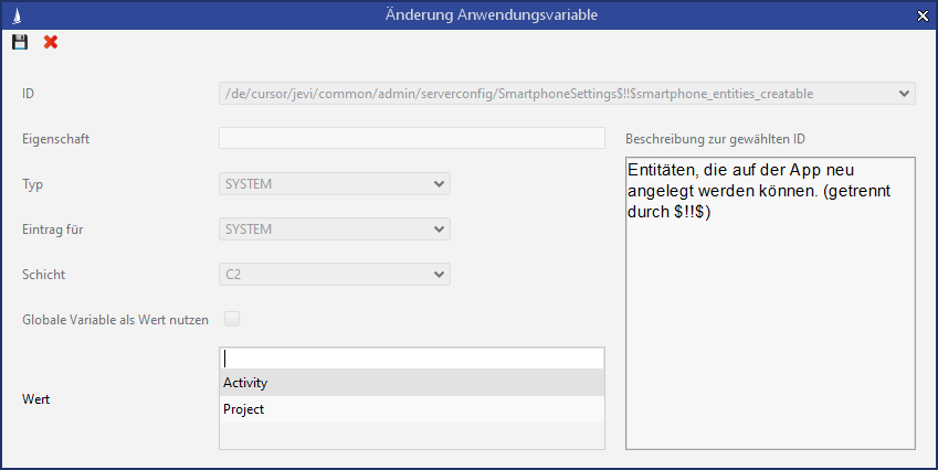 Um die Push-Notifications zu aktiveren muss die o.g. Anwendungsvariable zuerst angelegt und der Haken bei Wert aktiviert gesetzt werden. Im Default sind die Push-Notifications deaktiviert (auch wenn die o.g. Anwendungsvariable nicht angelegt wurde).