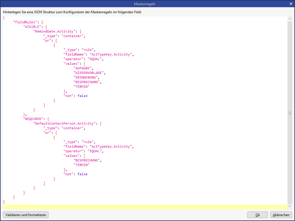 Das Feld Erinnerungsdatum (RemindDate) wird nur eingeblendet, wenn die Aktivitätsart "AUFGABE", "WIEDERVORLAGE", "ERINNERUNG", "BESPRECHUNG" oder "TERMIN" ist.
