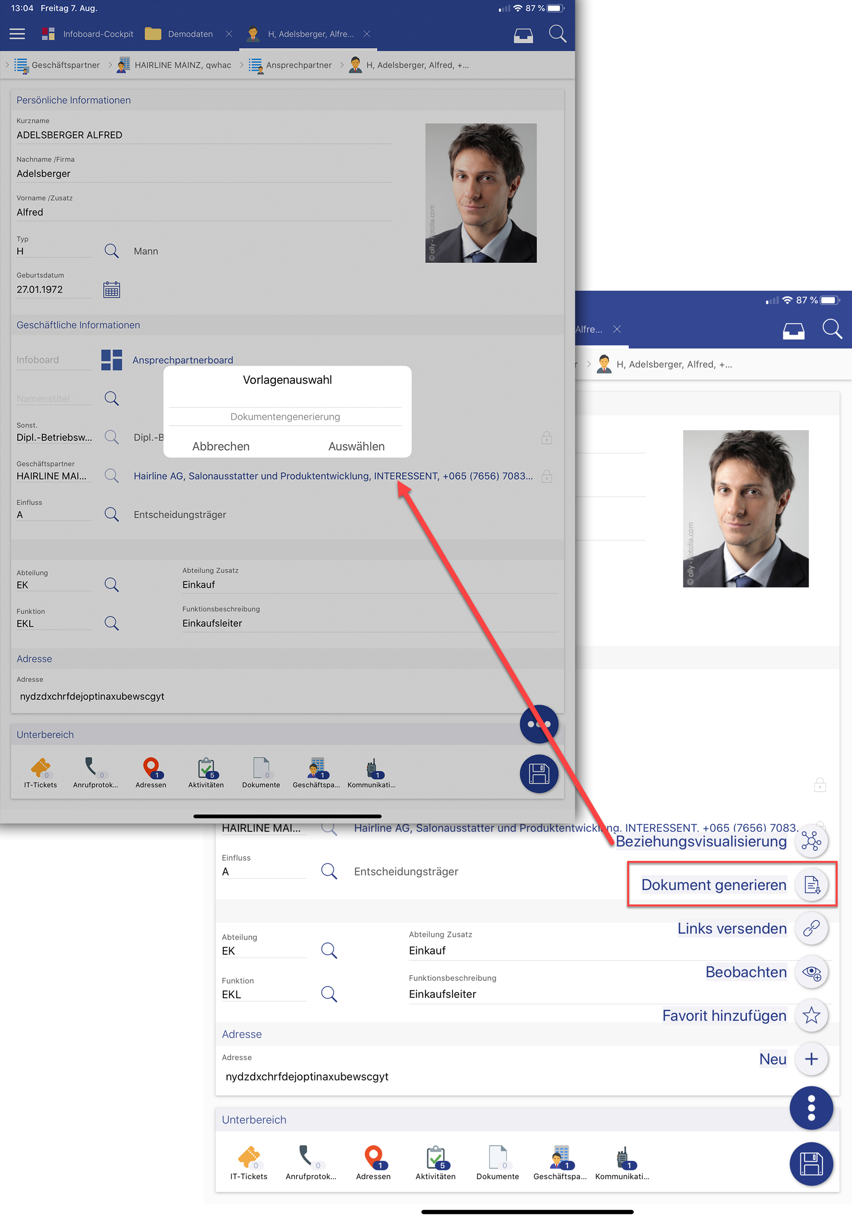 Erstellung einer Dokumentenvorlage "Dokumentengenerierung" für den Ansprechpartner