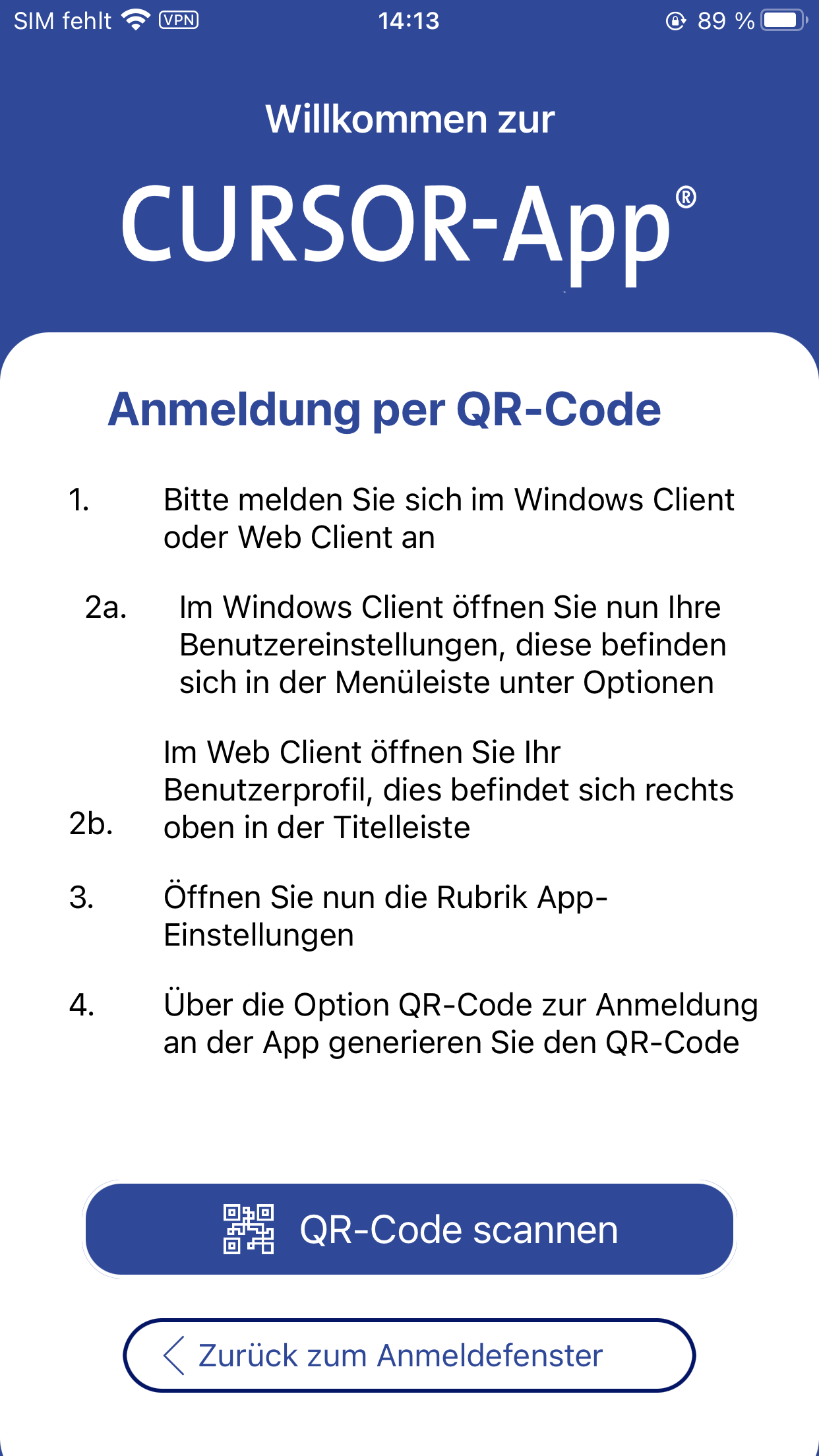 Wurde die CURSOR-App über das Kundenportal heruntergeladen, sind weitere Konfigurationen erforderlich. Dies ist mit dem Projektleiter der CURSOR Software Ag zu klären.