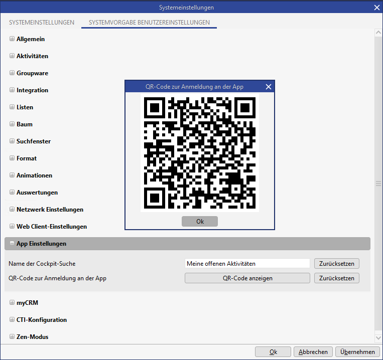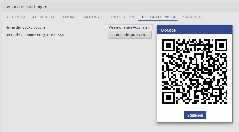 In den Benutzereinstellungen wurde ein Punkt zum Darstellen des QR-Codes mit Anmeldedaten generiert. Der QR-Code wird anschließend mit einem Klick generiert und auf dem Bildschirm angezeigt.