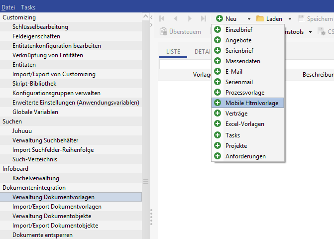 Es besteht die Möglichkeit Dokumente über die App zu generieren. Hierzu kann man in der Administrationskonsole im Bereich Verwaltung Dokumentenvorlagen die Vorlage Mobile Htmlvorlage auswählen.