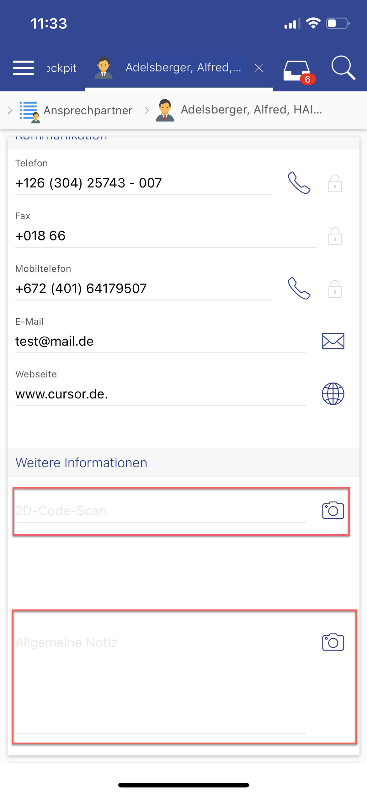 Es besteht nun die Möglichkeit einen 2D-Code zu scannen, anschließend werden die Daten in das konfigurierte Feld geschrieben.