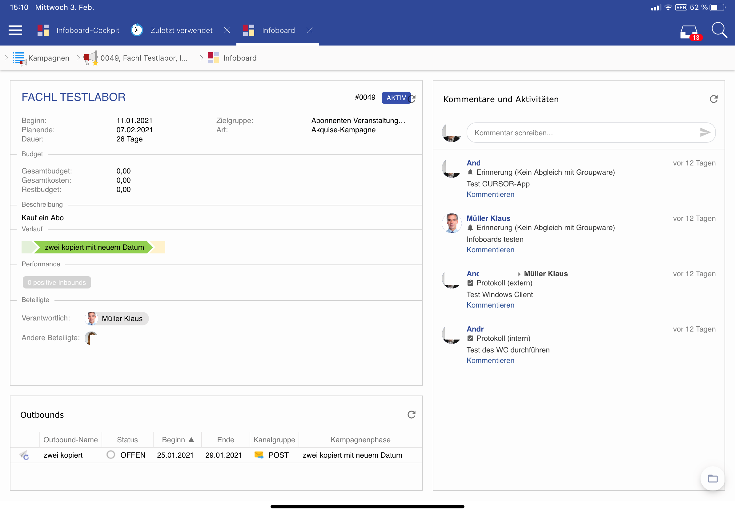 Auf dem Phone wird das Infoboard nur im Hochformat angezeigt, im Querformat ist das Infoboard nicht verfügbar. Die Infoboards sind auf der App nicht mehr veränderbar, es beinhaltet also einen rein lesenden Zugriff, verlinkte Datensätze u.Ä. funktioniert allerdings weiterhin.