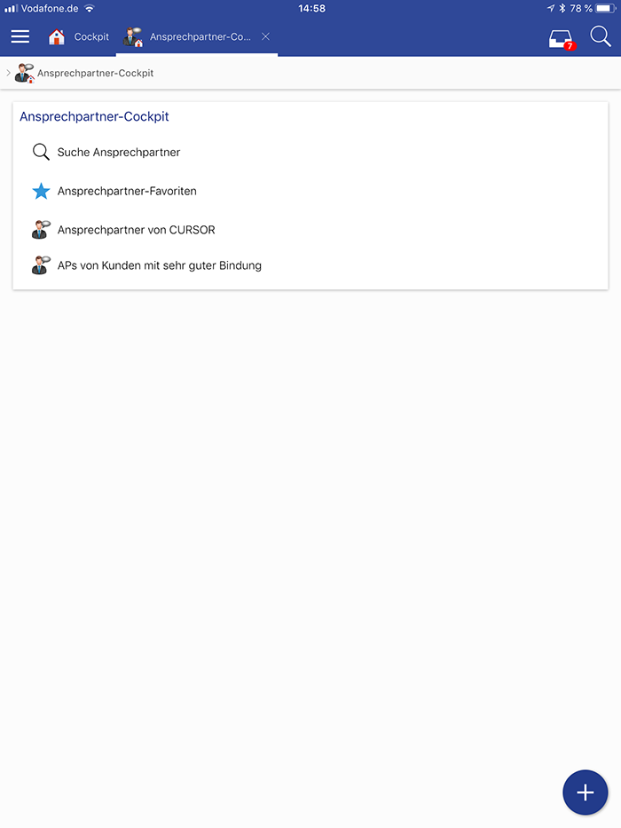 Die Reihenfolge der Kacheln ist im Gegensatz zum Windows- und Web Client vertikal. Die Darstellung im Windows- und Web Client von links nach rechts wird in der CURSOR-App nur im Querformat dargestellt.