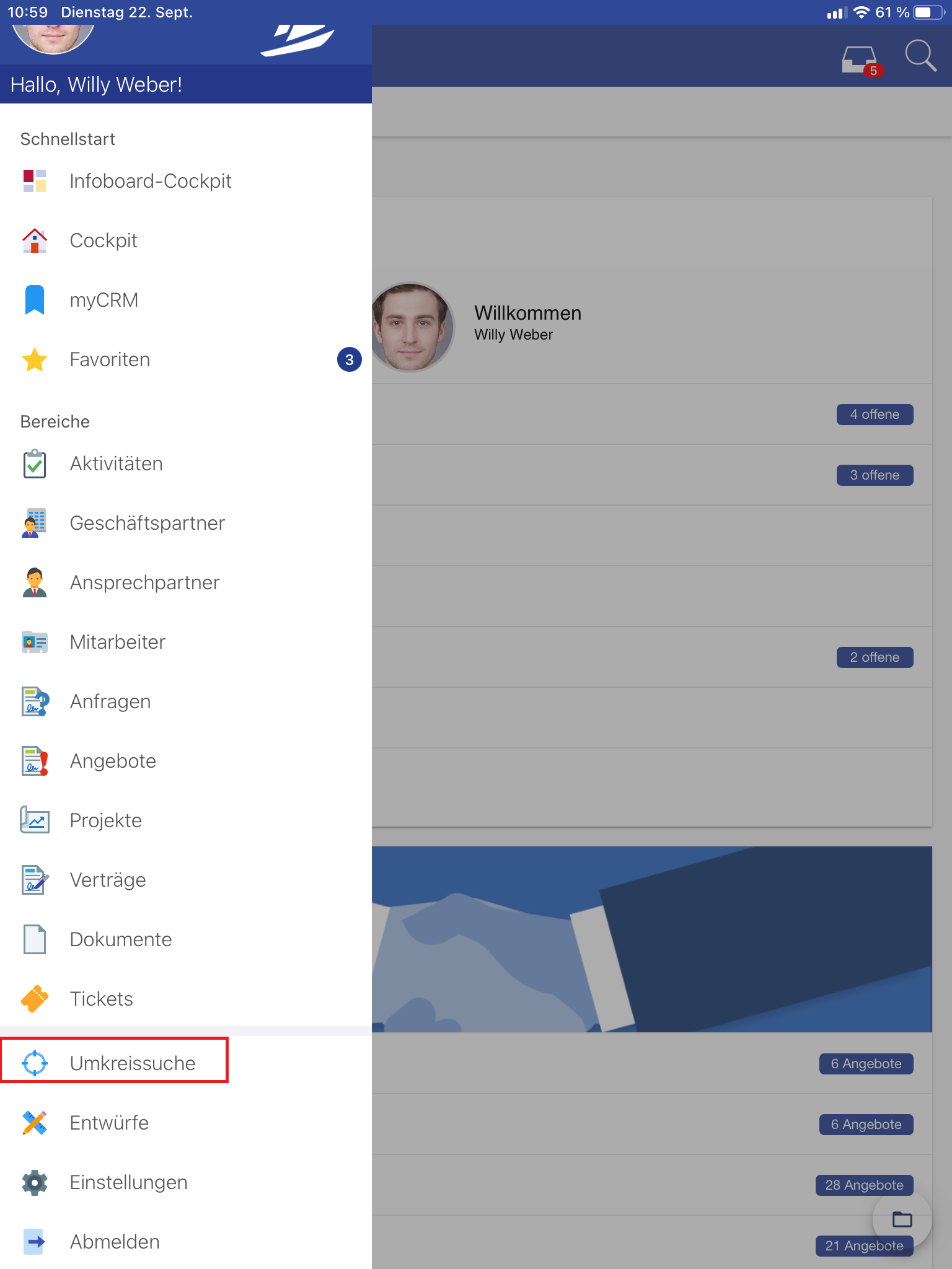 Die native Umkreissuche ermittelt alle Kunden die sich in dem angegebenen Radius ihres Standortes befinden. Diese wird im Cockpit über die Schnellstartleiste unten links gestartet.