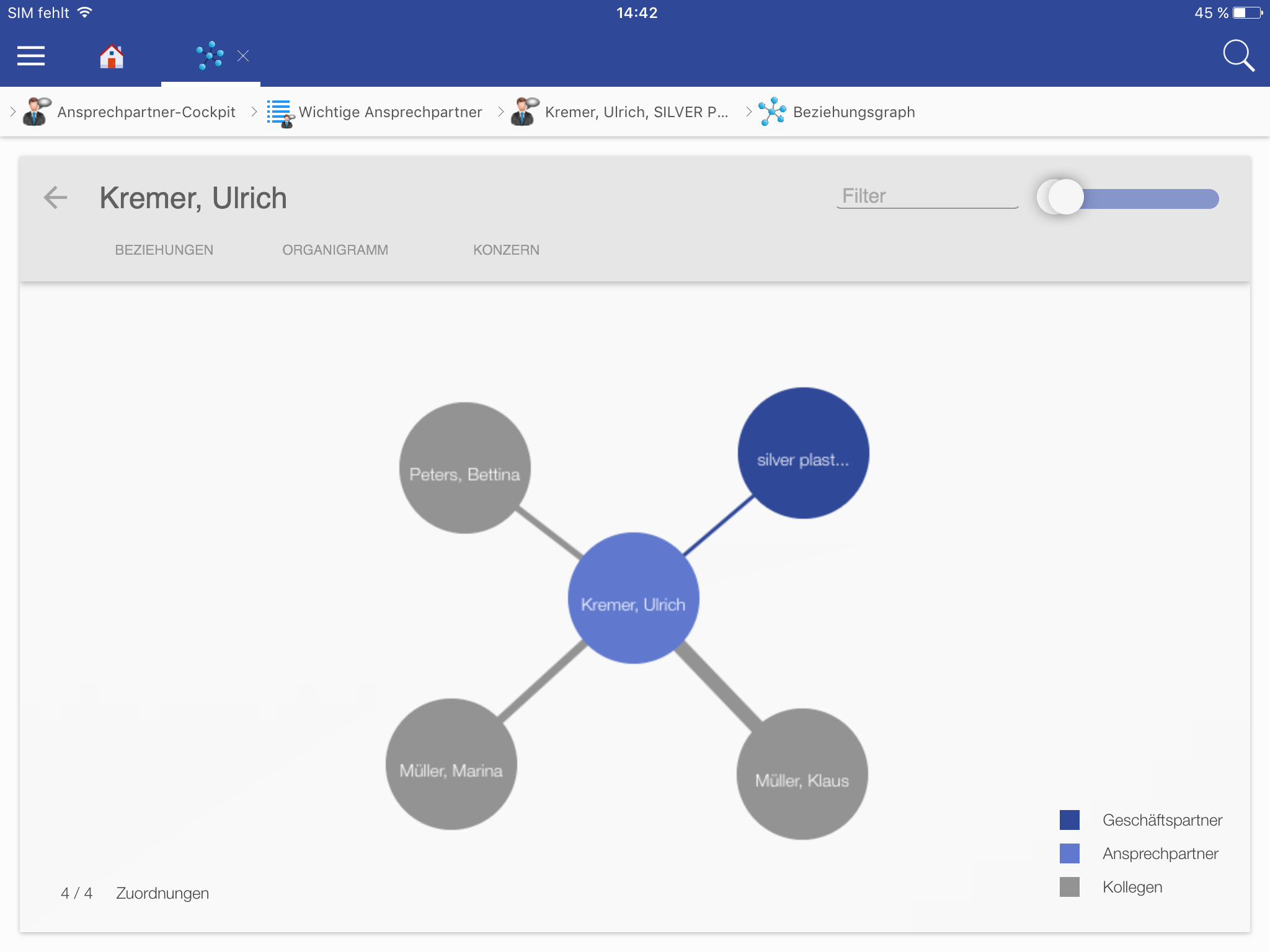 Auf den Bereichen Geschäftspartner, Ansprechpartner und Mitarbeiter gibt es auf der Detailansicht ein Icon über das die Beziehungen des ausgewählten Datensatzes angezeigt werden. Auf der rechten Seite befindet sich ein Slider über den die Menge (linker Button des Sliders) und die Stärke (rechter Button des Sliders) der Beziehungen eingestellt werden kann.