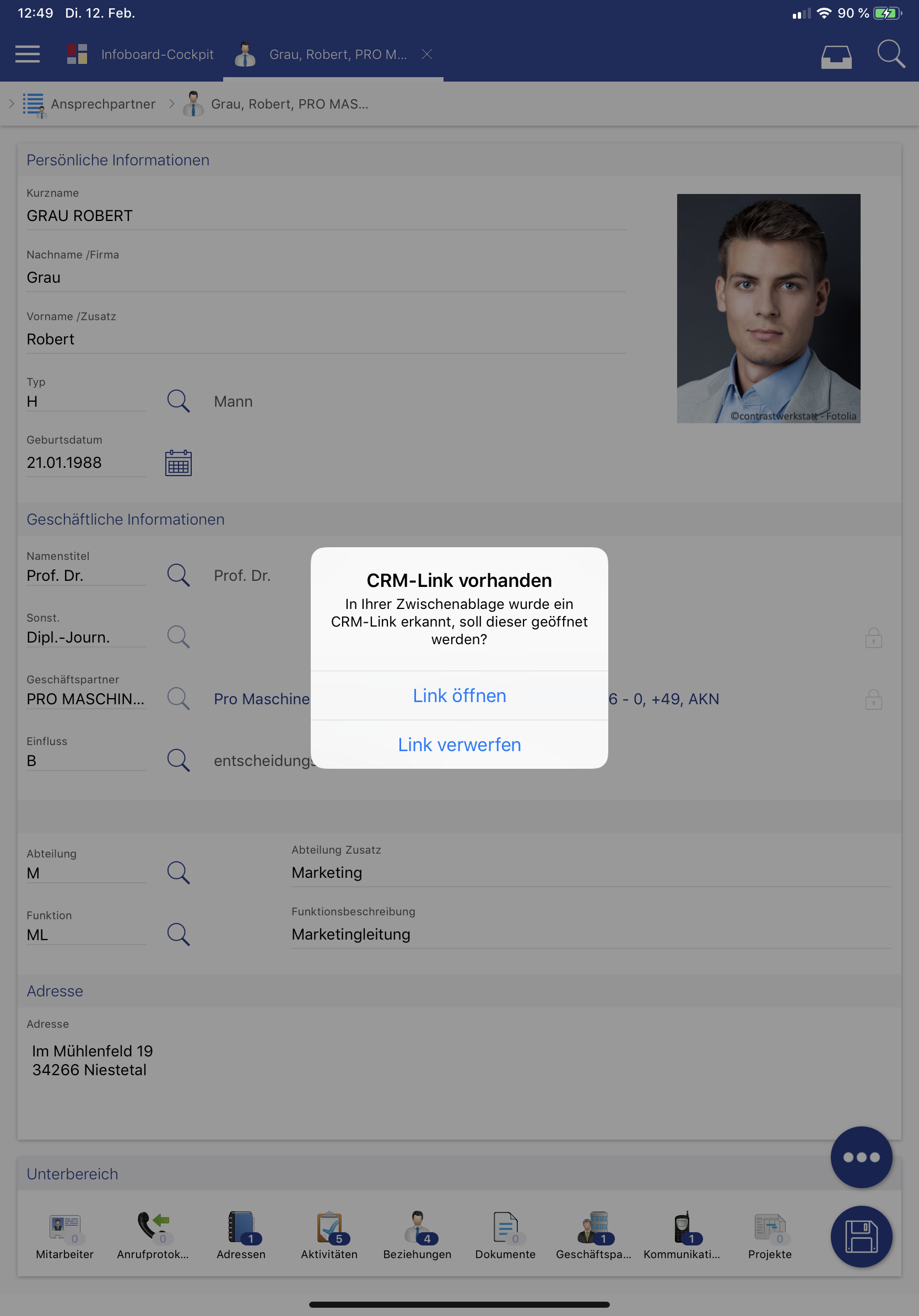 CRM-Links können nun auch in der App geöffnet werden. Hat man einen Windows oder Web Client Link in der Zwischenablage, so kann man über einen Klick auf das COMMAND Feld den Link öffnen. Wenn man hier Link öffnen auswählt, wird der Datensatz geöffnet und der CRM-Link bleibt in der Zwischenablage. Wählt man Link verwerfen aus, wird die COMMAND Suche geöffnet und der CRM-Link aus der Zwischenablage entfernt.
