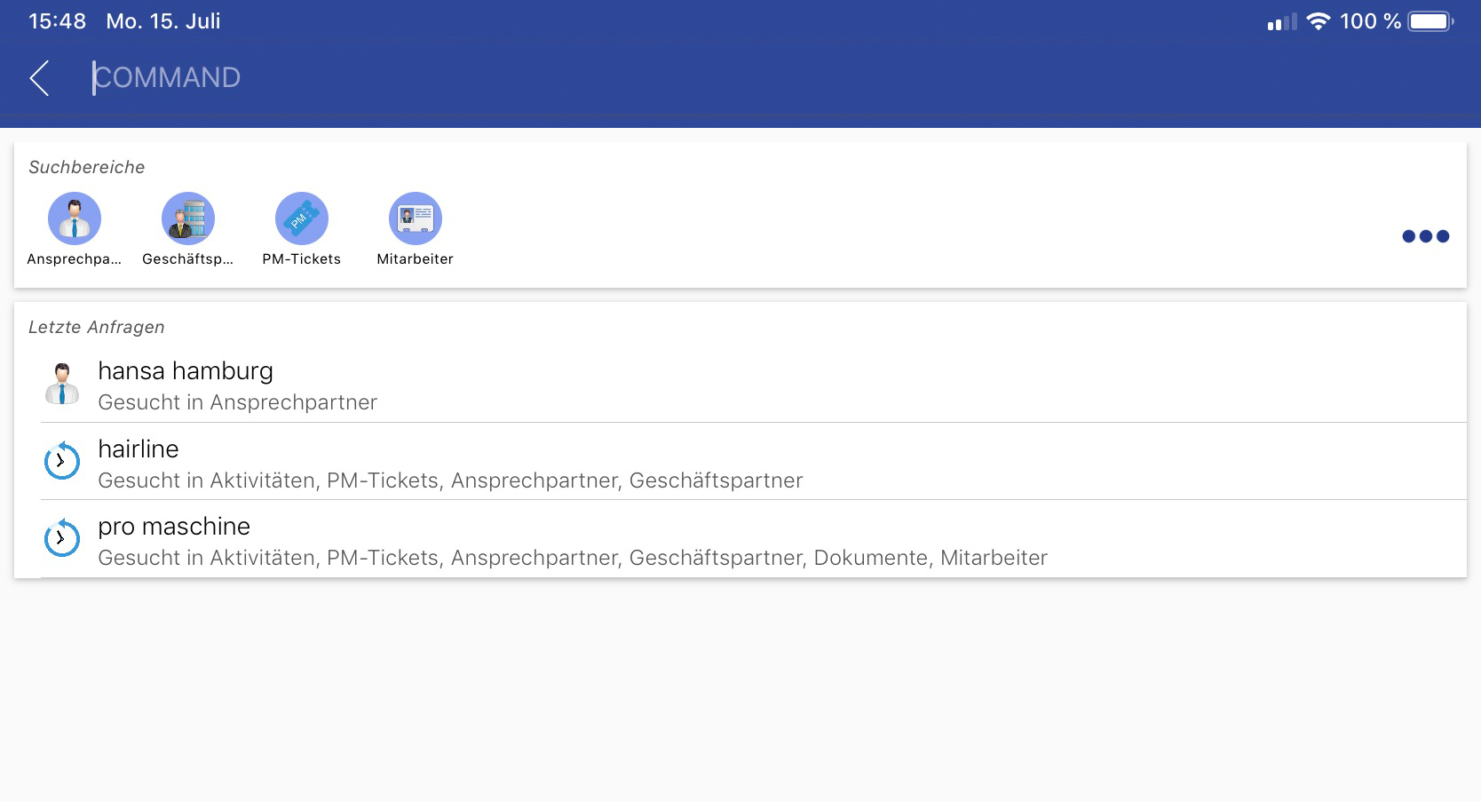In COMMAND werden die letzten Suchanfragen gespeichert, dies wird in der Übersichtsseite visualisiert. Hier werden neben dem Suchbegriff noch die in der Suche ausgewählten Suchbereiche angezeigt. Mit einem Klick auf die Zeile wird die Suche erneut ausgeführt und man landet in der gleichen Ergebnismenge.