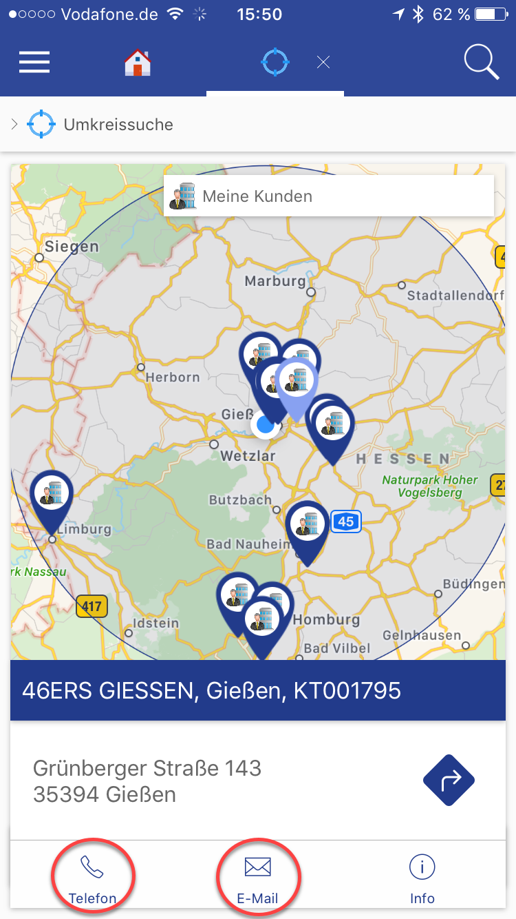 Desweiteren hat man die Möglichkeit verschiedene Interaktionen aus der Umkreissuche durchzuführen, diese sind z.B. telefonieren oder eine Mail zu versenden. Hierfür muss nur in der Suche in dem ausgewählten Feld der Haken bei "Anzeige in Listen" aktiviert sein.