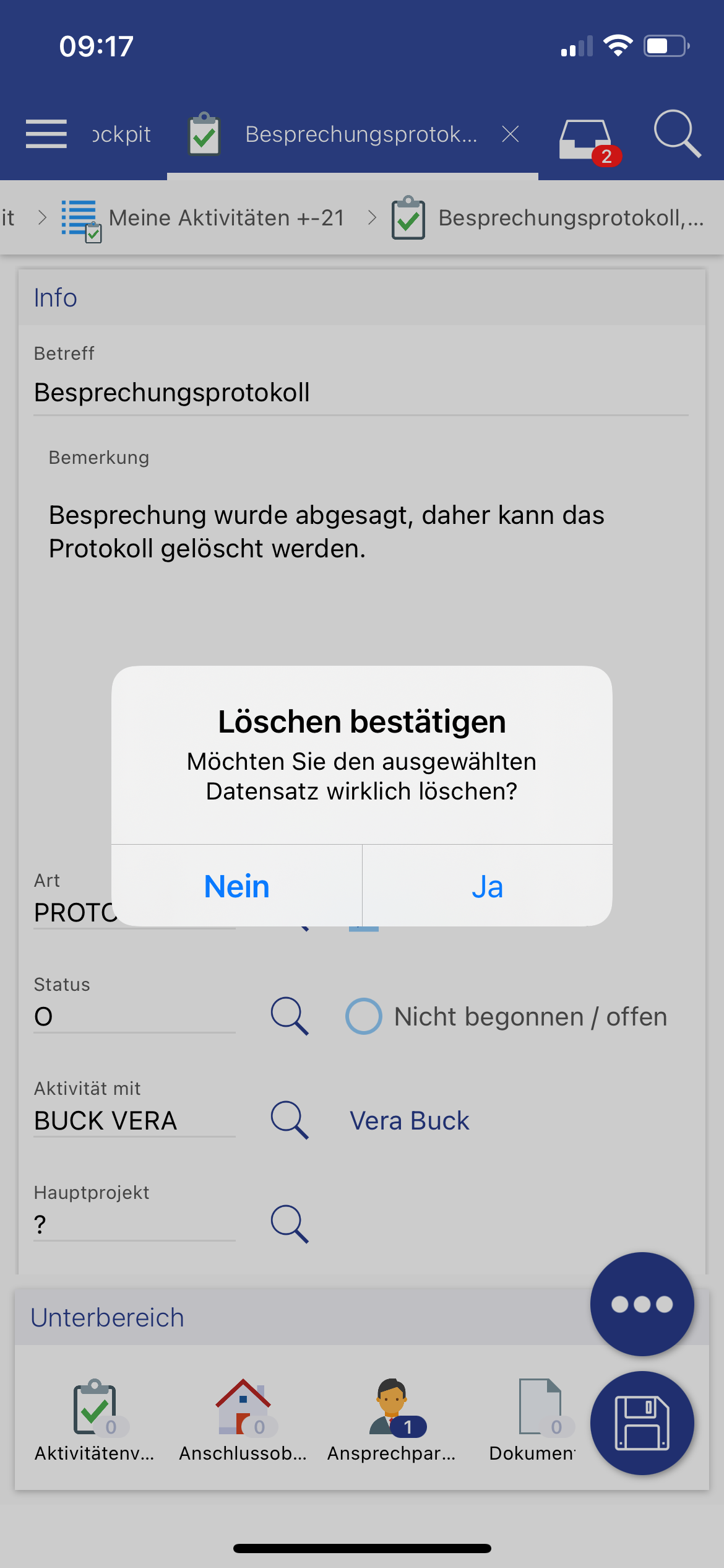 Es wurde ermöglicht, dass Datensätze über die App gelöscht werden können. Dies ist sowohl in der Detailansicht eines Datensatzes über das Drei-Punkte Menü unten rechts möglich, als auch in der Listenansicht. Hier wird nach einem Long-Touch auf einem Datensatz unten rechts das gleiche Drei-Punkte Menü angezeigt und es erscheint die Aktion "Löschen" mit anschließender Sicherheitsabfrage.