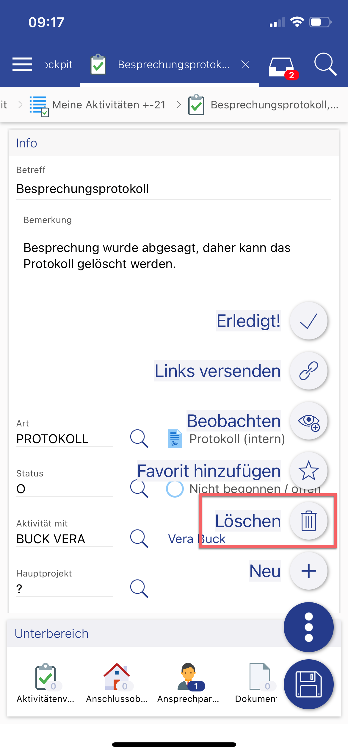 Löschen in der Detailansicht