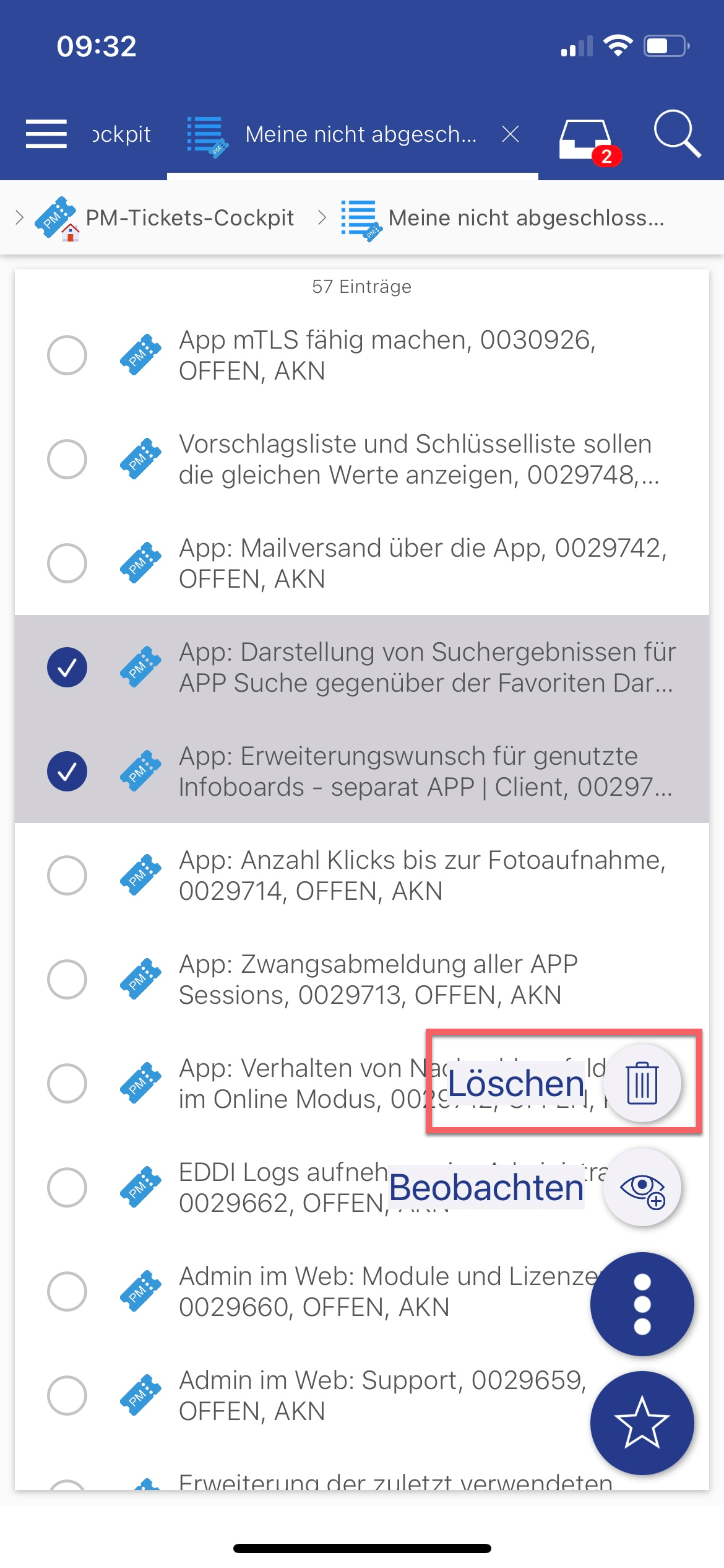 Über einen einfachen Klick wird der Eintrag geöffnet. Wenn man einen Longtouch auf einem Eintrag ausführt, so kann man weitere Interaktionen antriggern, wie z.B. als gelesen markieren oder auf erledigt setzen, die ausgeführt werden können. Hier können auch mehrere Einträge ausgewählt und eine Multiaktion ausgeführt werden.