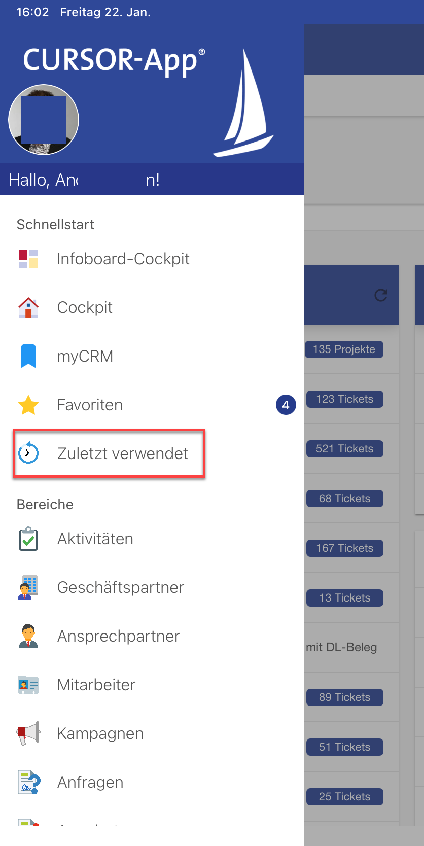 Auf der App wurde die Funktionalität "Zuletzt verwendet" eingebunden. Diese Einträge stehen nach der Anmeldung an der App auch Offline zur Verfügung. Diese sind über den NavigationDrawer erreichbar.