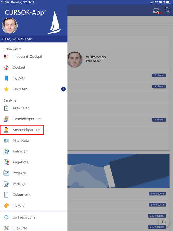 Ansprechpartner in Groupware übernehmen auf der CURSOR-App