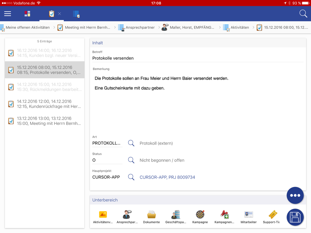 Favoriten Datensätze können über Nachschlagefelder ausgewählt werden. Ein beispielsweise als Favorit (Offline) gekennzeichneter Ansprechpartner kann nun in dem Feld "Aktivität mit" auf den Aktivitäten via Vorschlagsliste oder über die Nachschlage-Lupe ausgewählt werden. Als Anzeige werden hier die ID Felder angezeigt, daher kann es bei der Darstellung im Gegensatz zu der Online Vorschlagsliste zu Abweichungen kommen.