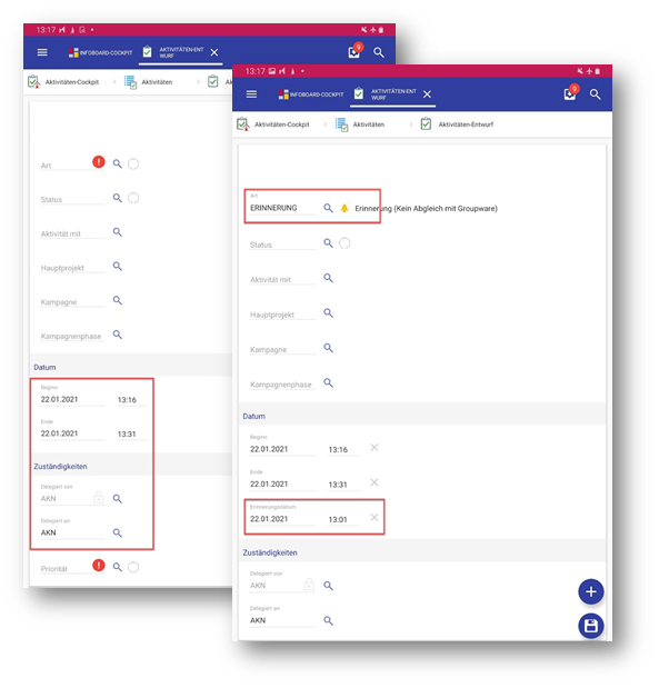 In der Offline Neuanlage von Aktivitäten werden nun auch die Vorbelegungen für Aktivitäten berücksichtigt. Dies betrifft die folgenden Felder: