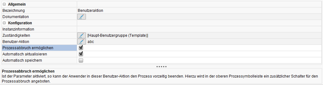 Als separate Option kann auf der Benutzeraktion Prozessabbruch ermöglichen aktiviert werden.
