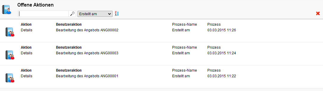 Die Liste der offenen Aktionen im CRM zeigt alle anstehenden, offenen Prozess-Schritte für den aktuellen Benutzer mit Erstellungsdatum, Name der Aktion und des Prozesses. Das Symbol unterscheidet Gruppen- und Benutzer-Aktionen. Beide Aktionstypen besitzen die gleiche Priorität.