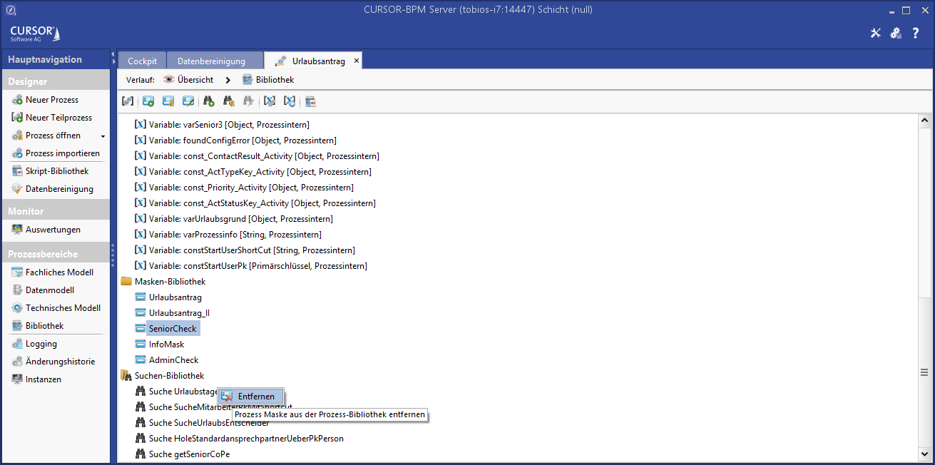 Suchen und Masken aus dem CURSOR Standard oder einem Partnermodul können unabhängig vom Prozess übersteuert werden. Zum Zeitpunkt des Veröffentlichens wird die Definition aus der höchsten Customizing-Schicht geladen. Durch das Entfernen einer übersteuerten Suche oder Maske man den Ursprungszustand im Prozess wiederherstellen.