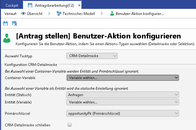 Variable auswählen, die den Primärschlüssel enthält, mit dem die CRM-Detailmaske geöffnet werden soll (daher sind nur Variablen vom Typ Object oder PrimaryKey zulässig)