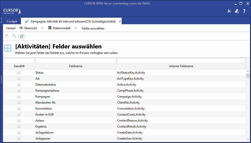 Beim Hinzufügen einer Entität werden alle Felder der Entität in das Datenmodell übernommen. Über den Auswahl-Editor können Sie zwecks Übersichtlichkeit alle im Prozess nicht benötigten Felder entfernen.