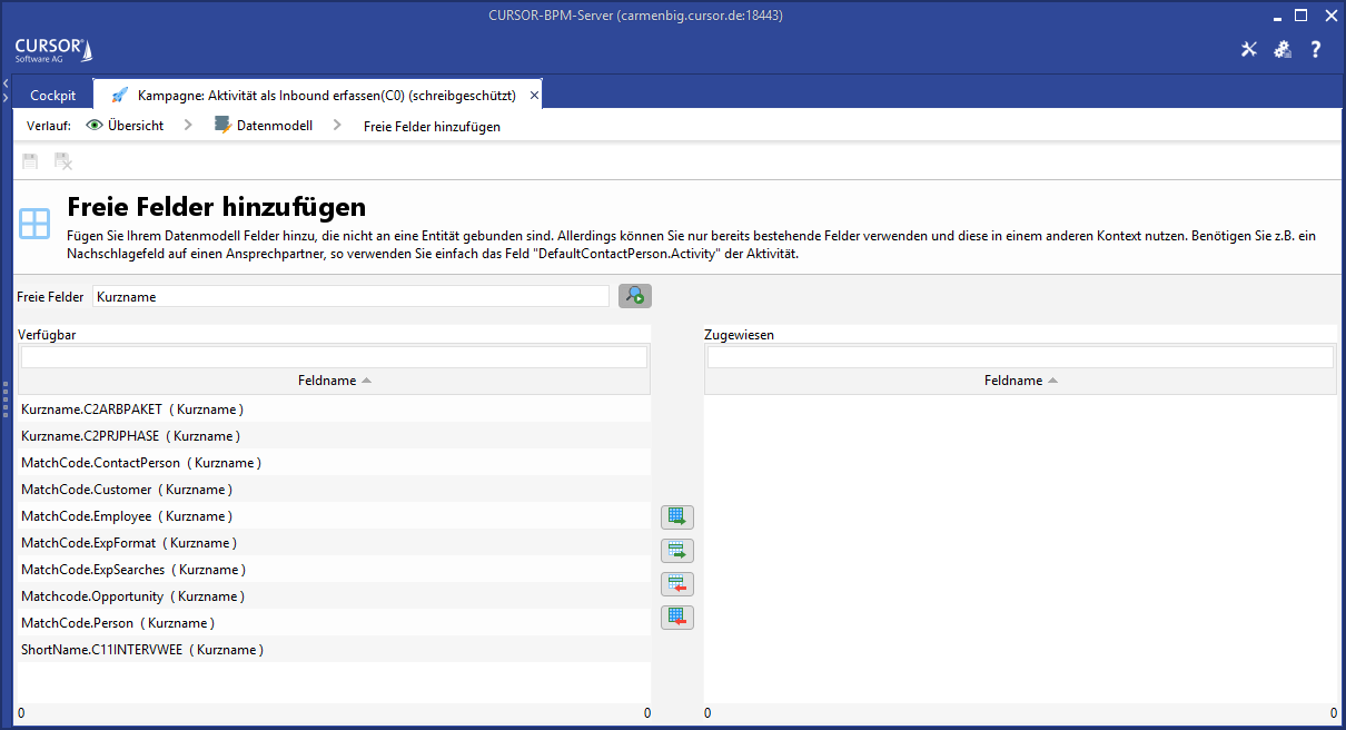 Um die Möglichkeiten der Felder im CRM vollständig nutzen zu können, müssen die Felder im CRM existieren und dort über die Standardfunktionalitäten konfiguriert werden. Die Konfiguration der Felder wird dann für das jeweilige Feld in die Prozessmasken übernommen.