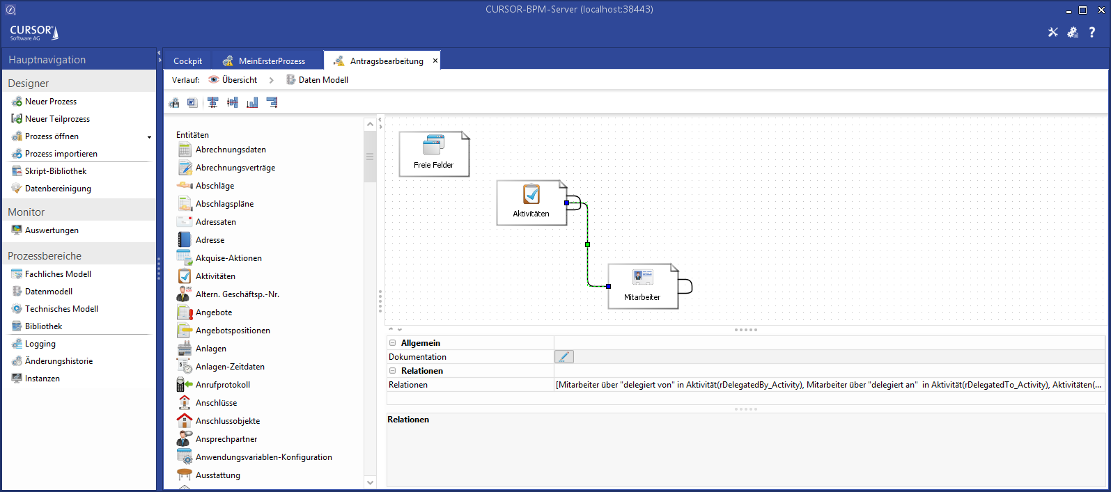 Benötigte Entitäten können dem Prozess per Drag and Drop aus der Palette hinzugefügt werden.