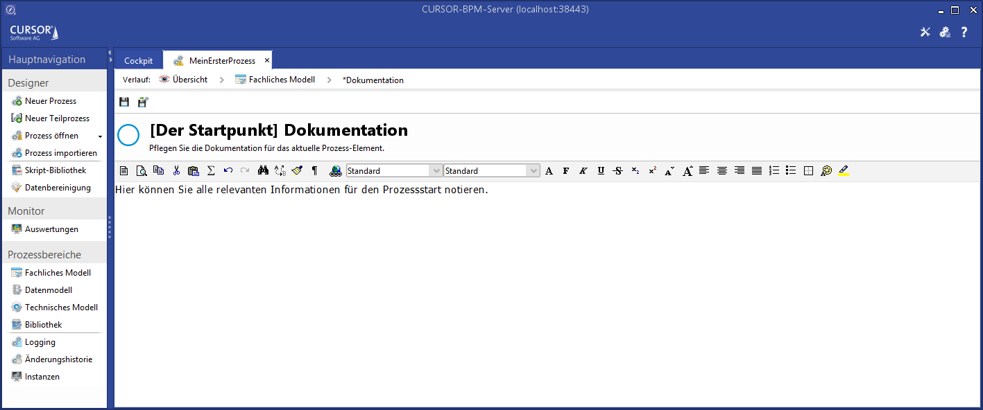 Die Bearbeitung von Elementen erfolgt über Drag and Drop oder mittels Editoren, wie beispielsweise im Falle der Dokumentation. Die Editoren nutzen den zur Verfügung stehenden Platz, um möglichst viele Informationen anzeigen zu können. Die Navigation erfolgt daher über die Zeile Verlauf. Sie können dort z. B. auf