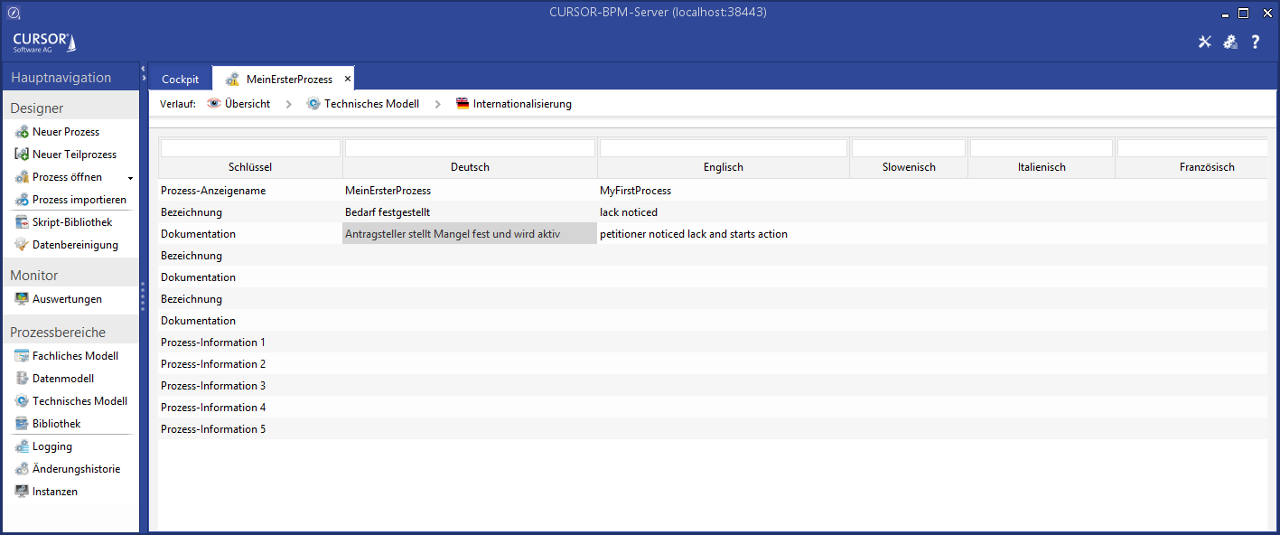 In den beiden Prozessmodellen befindet sich der Schalter Internationalisieren. Dieser dient dazu, für das aktuell markierte Element die Übersetzung zu hinterlegen. Dazu öffnet sich eine Tabelle, in der die Bezeichnung und die Dokumentation der markierten Elemente angezeigt und geändert werden können.