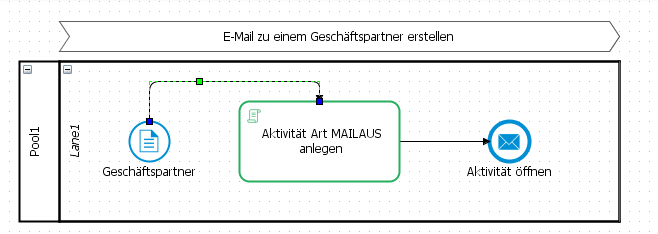 Das nachträgliche Ändern des Flusses ist möglich, indem Sie das Fluss-Element markieren und den Start- oder Endpunkt auf ein anderes Element verschieben. Zudem können Sie die Linie des Flusses beeinflussen, indem Sie die grüne Markierung des Fluss-Elementes verschieben: