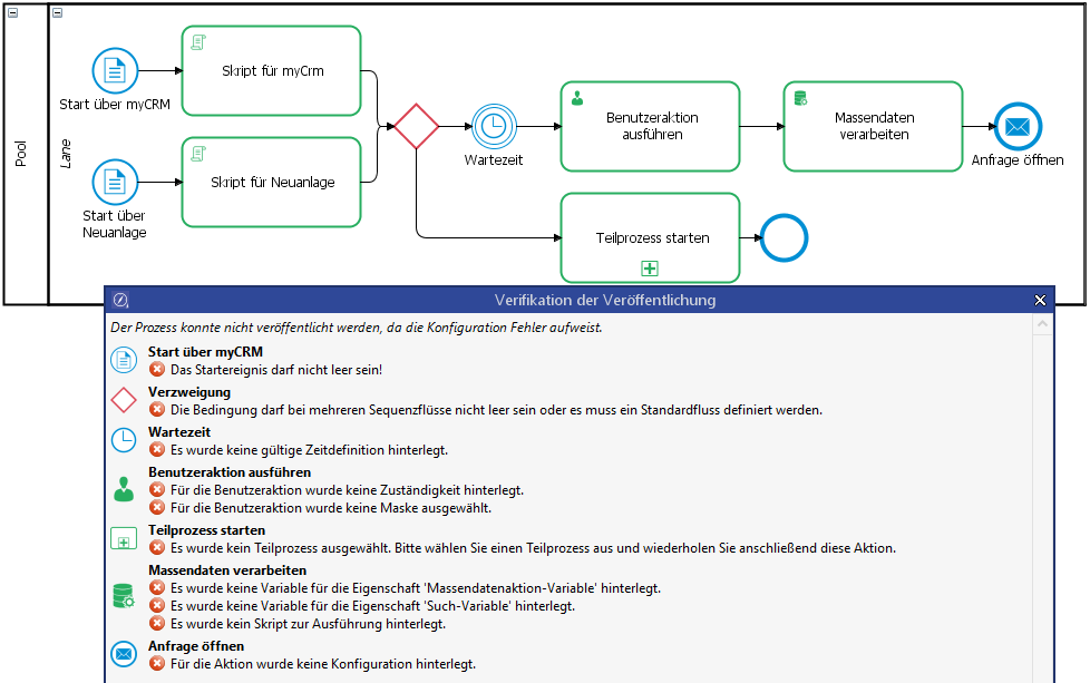 Über den Dialog kann die fehlerhafte Aktion im Prozess-Modell markiert werden. Erst wenn alle Fehler im Prozess-Modell behoben sind, kann der Prozess veröffentlicht werden. Eine Prüfung auf gültige Definitionen von Prozessvariablen erfolgt nicht, da sich dies im Laufzeitverhalten der Prozesse unterscheiden kann.